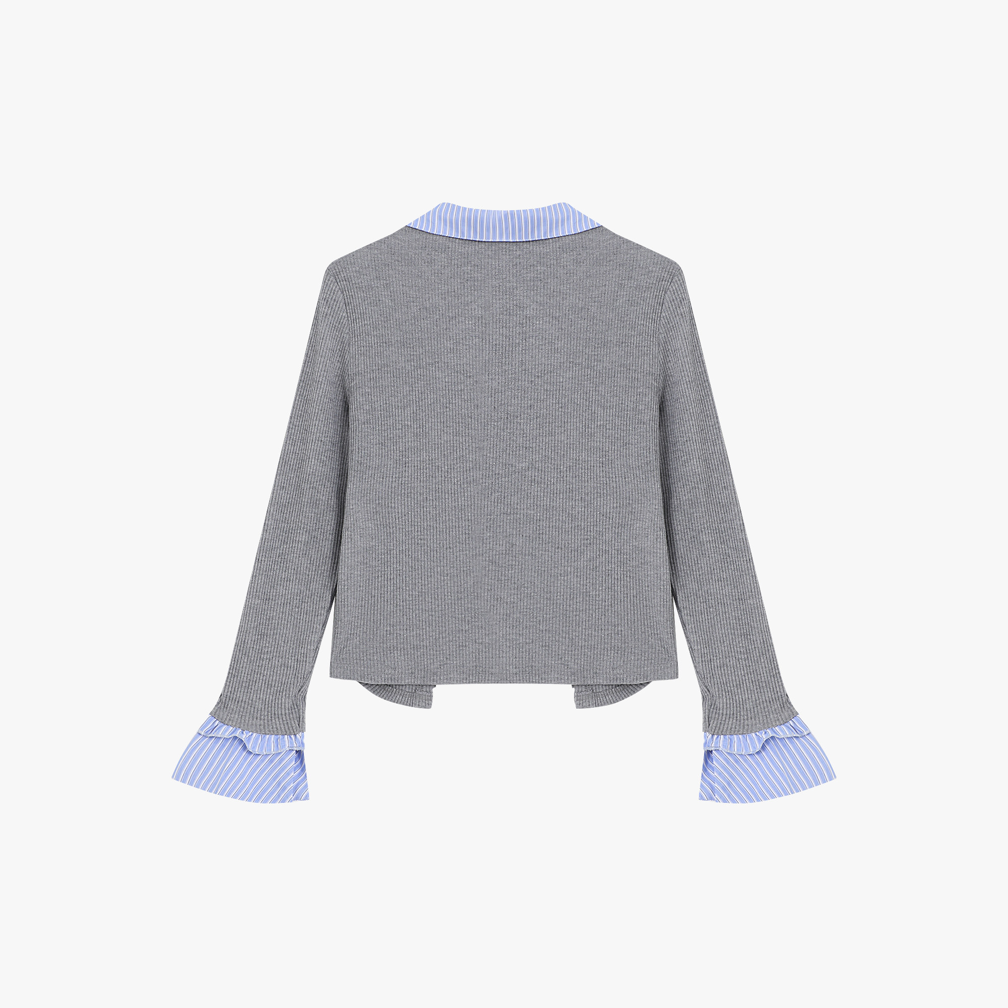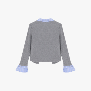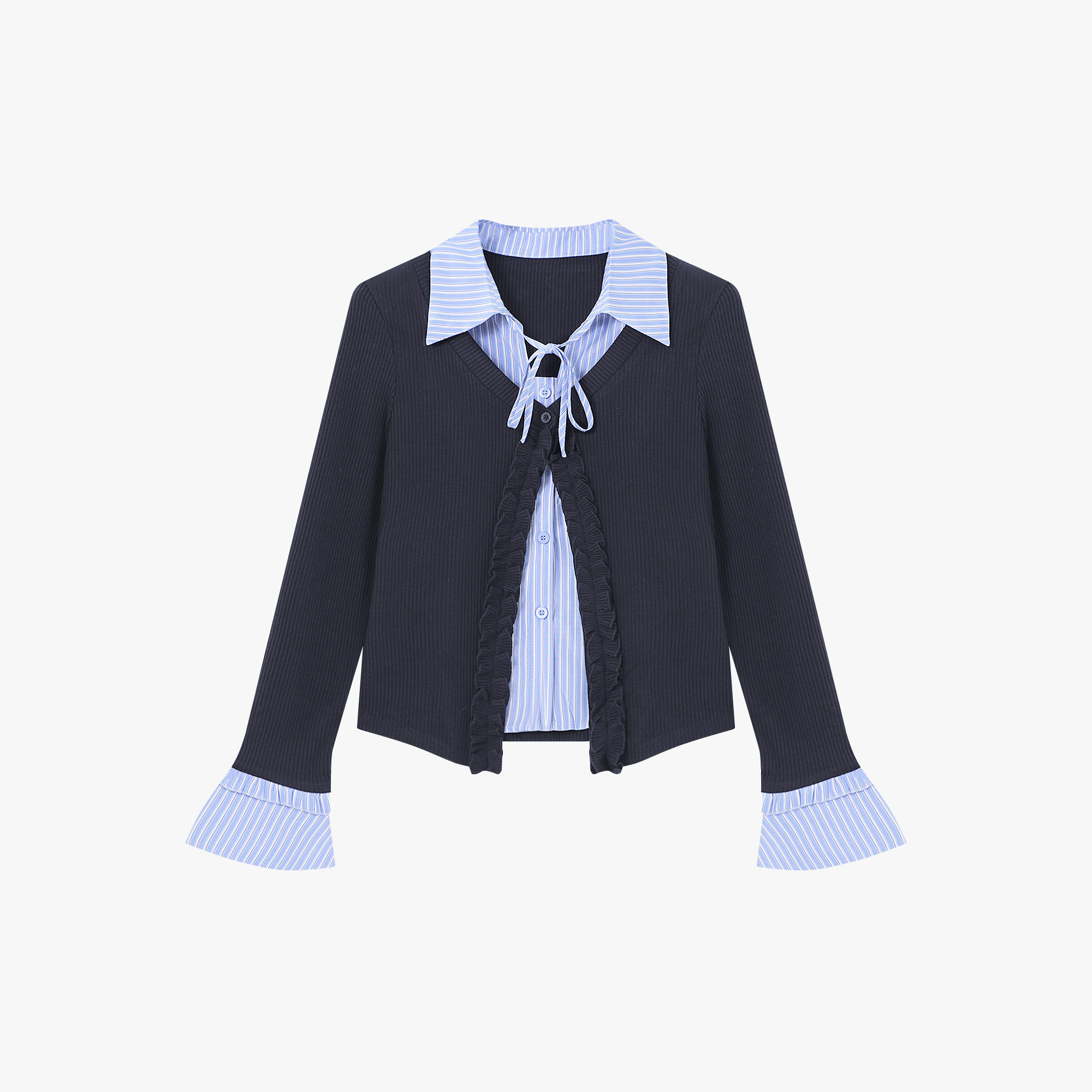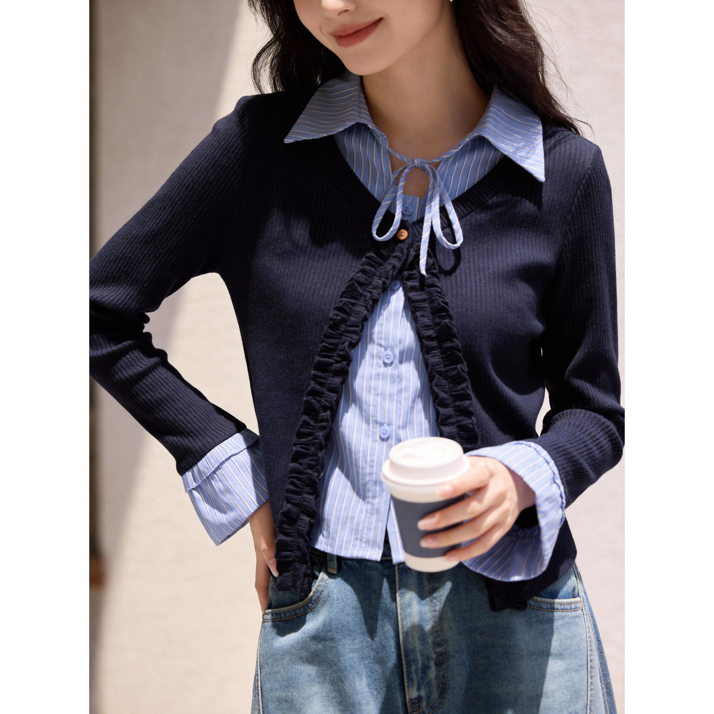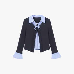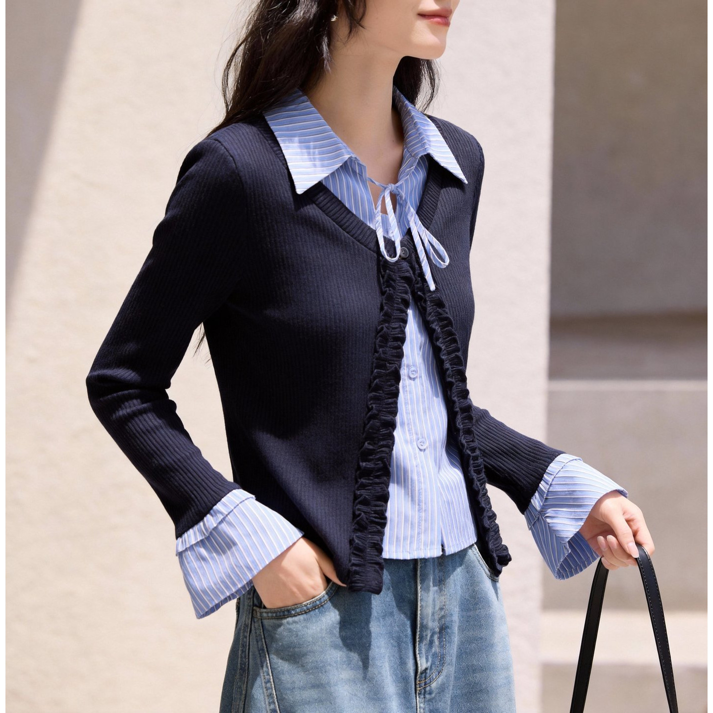 领针织衫 长袖 女春季 木耳边设计修身 上衣 新款 百家好假两件条纹衬衫