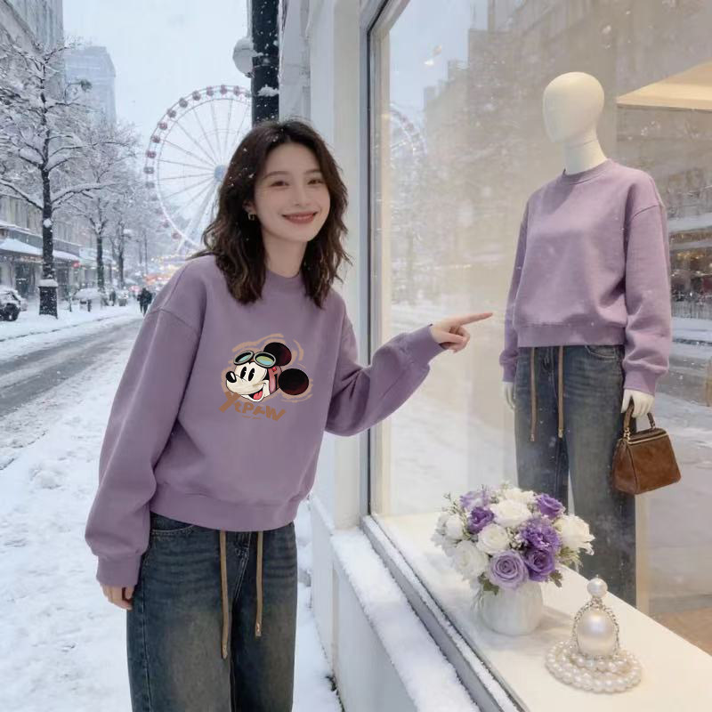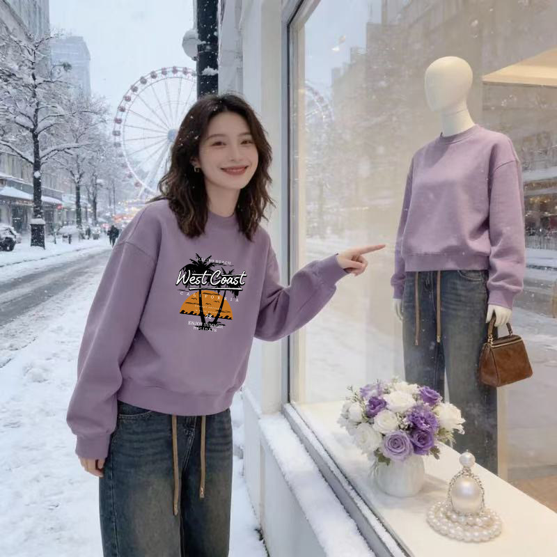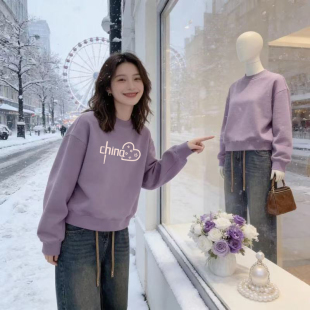 宽松胖mm韩版 加绒设计感卫衣休闲大码 小个子外套 圆领长袖 2026新款