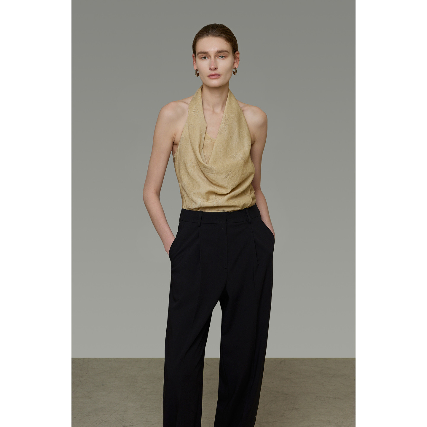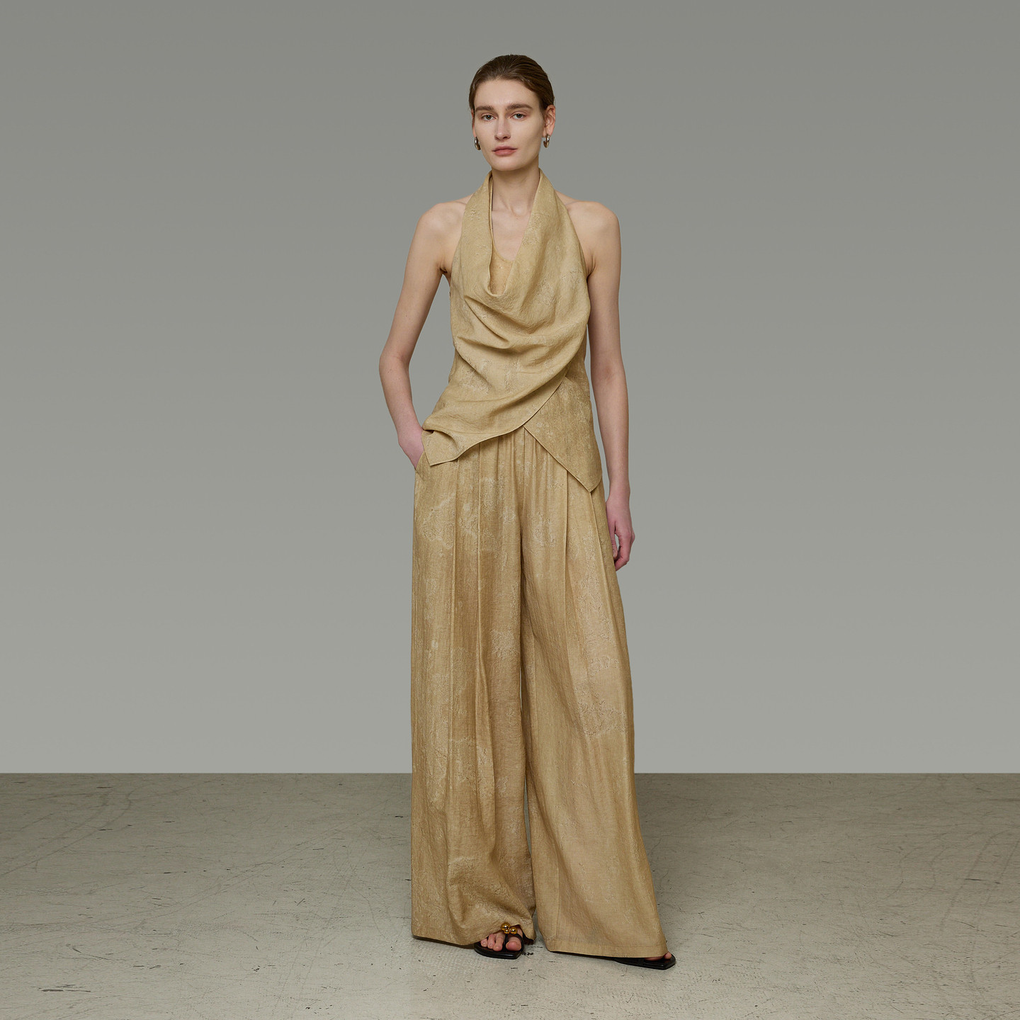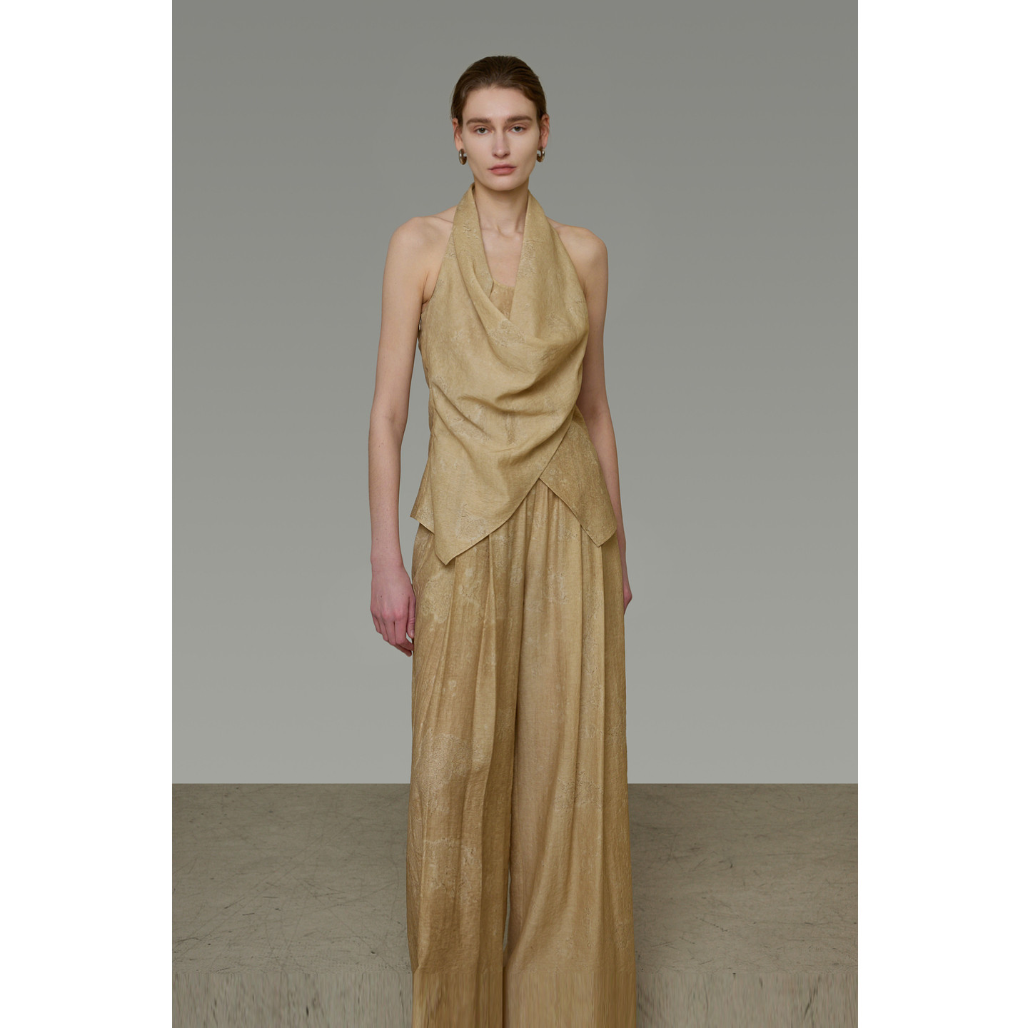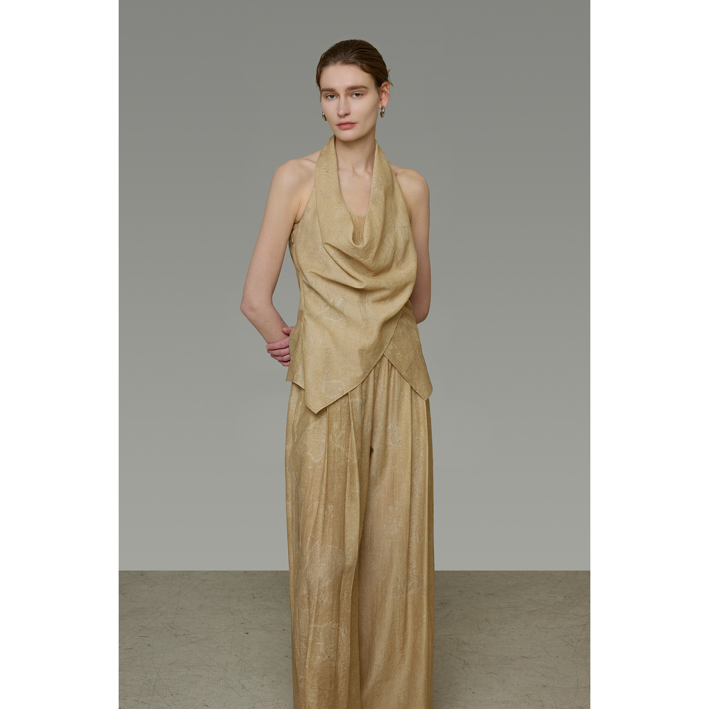 设计感两件套装 UNSPOKEN荡领挂脖无袖 上衣女卡其色宽松阔腿休闲裤