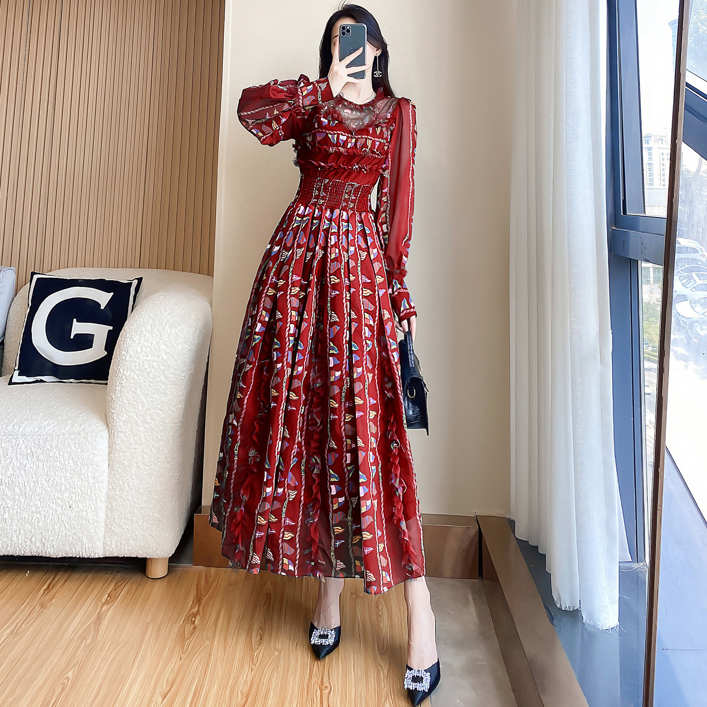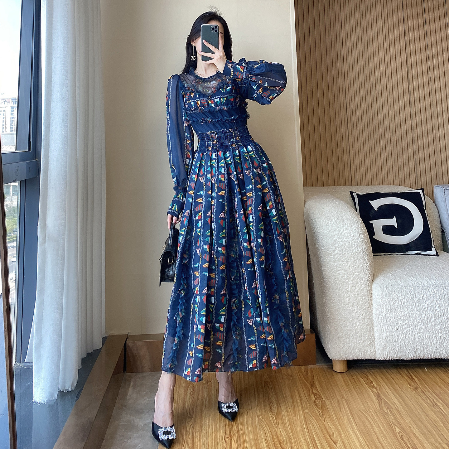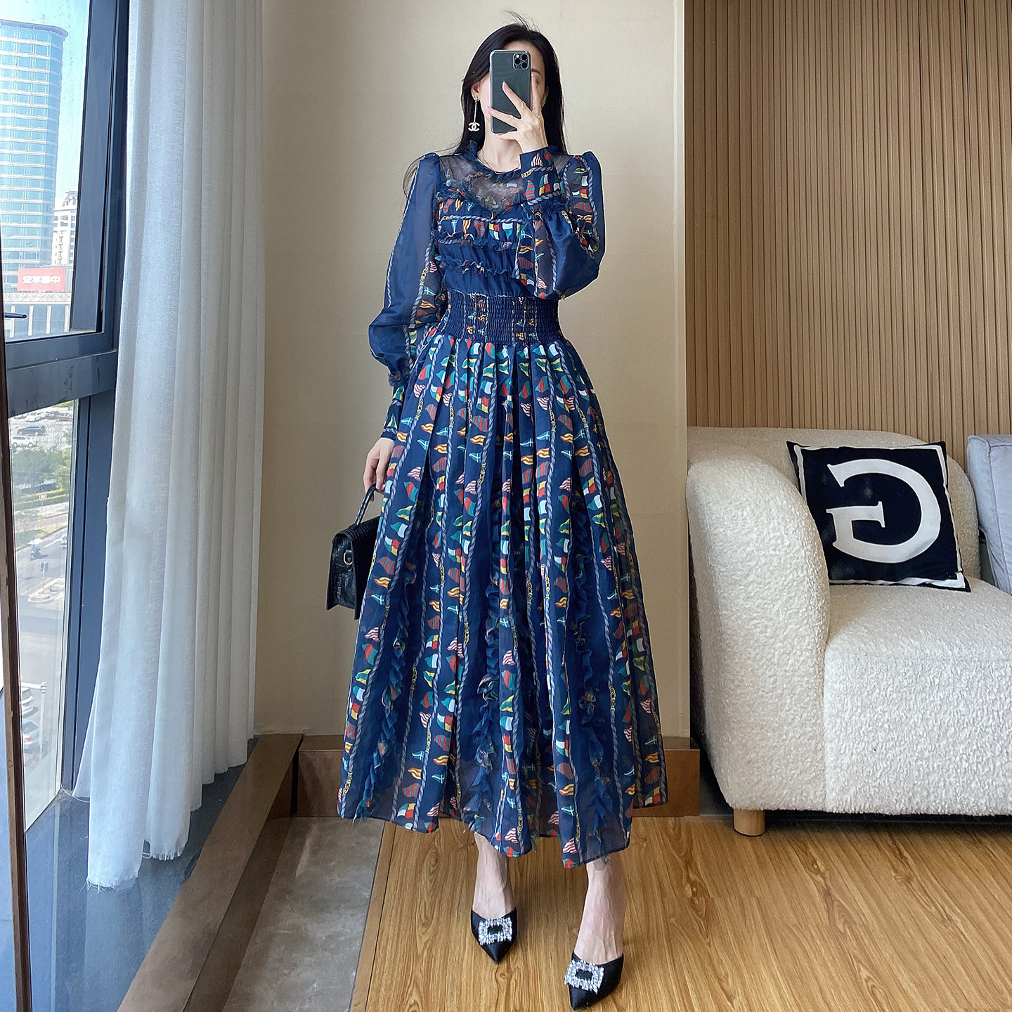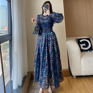 轻奢高级感雪纺碎花旅游度假长裙 新款 波西米亚长袖 连衣裙2026春季
