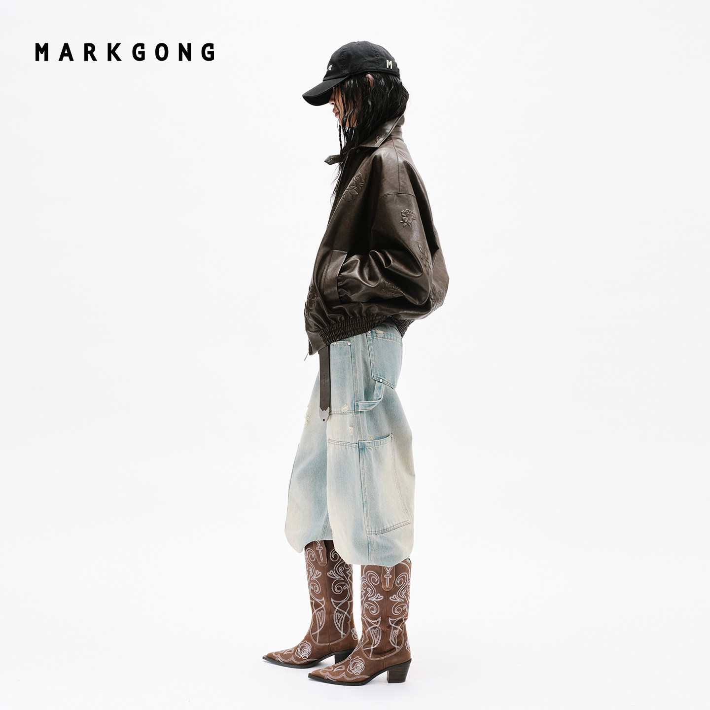 女装 蓝牛仔棕色皮革立体印花棒球外套2026春夏新品 MARKGONG