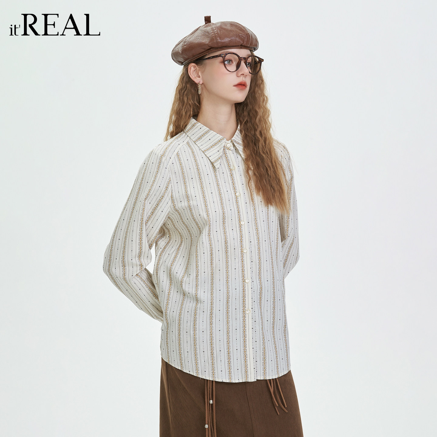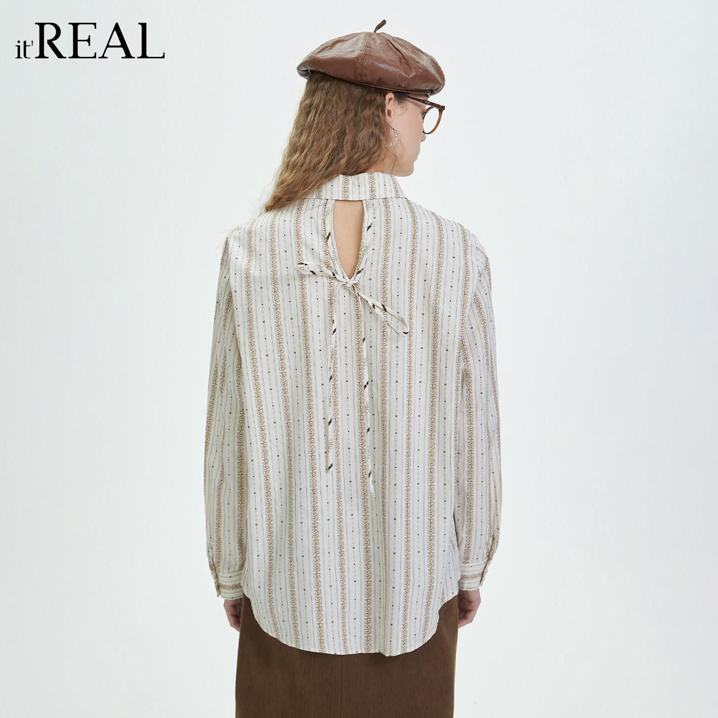 翻领系带收腰百搭设计感上衣 女长袖 real复古通勤风条纹衬衫