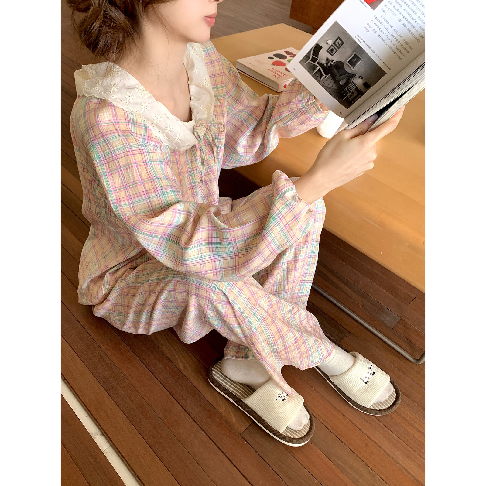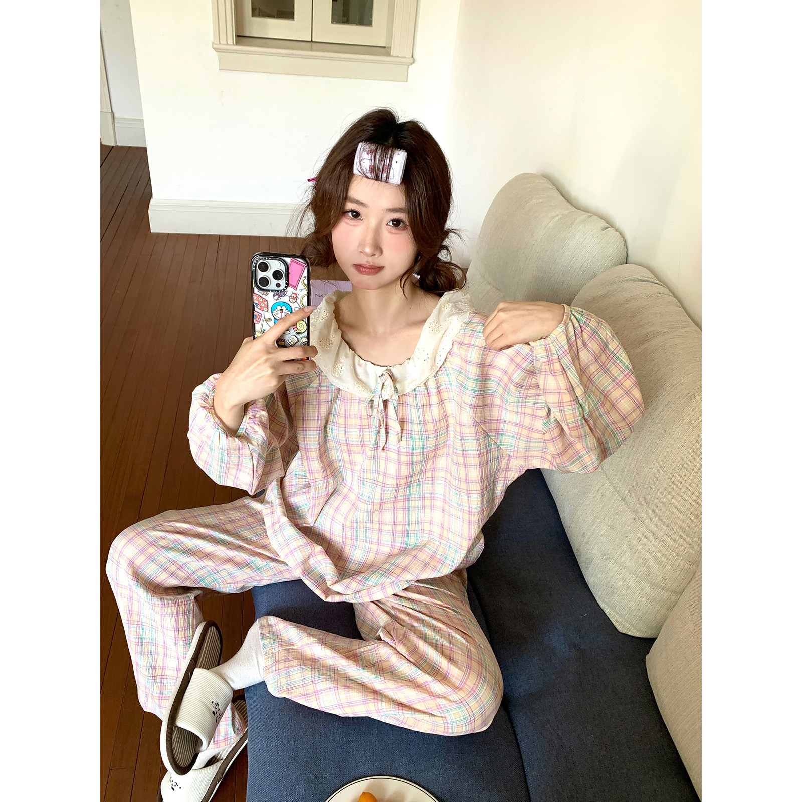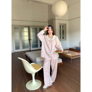 馨帮帮Homedress 甜美刺绣花边格纹睡衣女春秋圆领套头家居服套装
