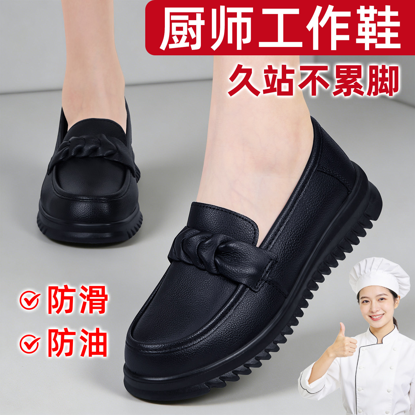 女软底上班不累脚厨房黑色皮面防水防油单鞋 2026春新款 防滑工作鞋