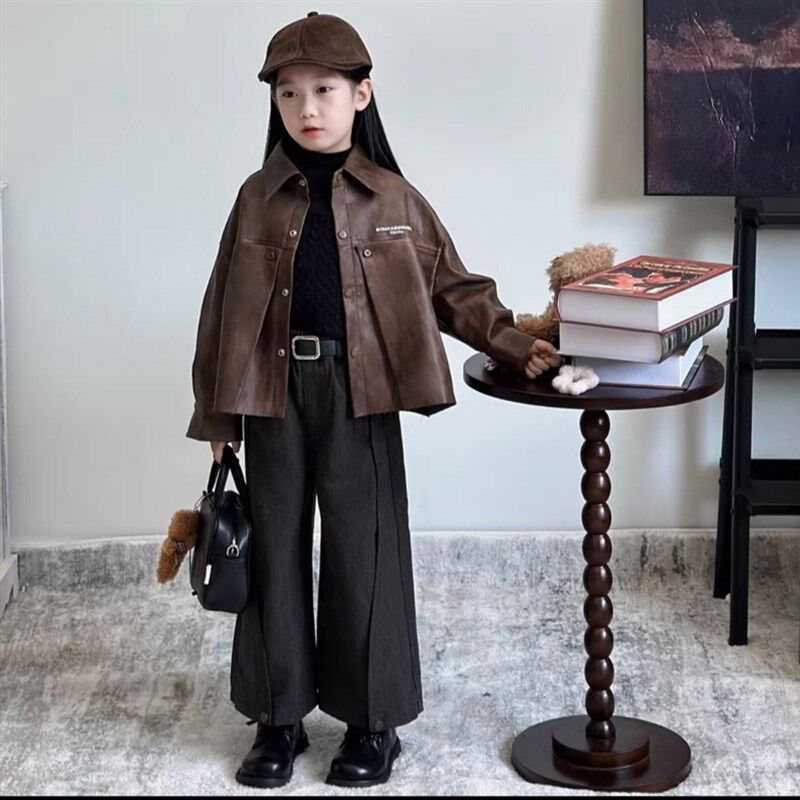 复古夹克外套毛衣春秋阔腿裤 儿童套装 三件套 2024新款 女童皮衣秋季