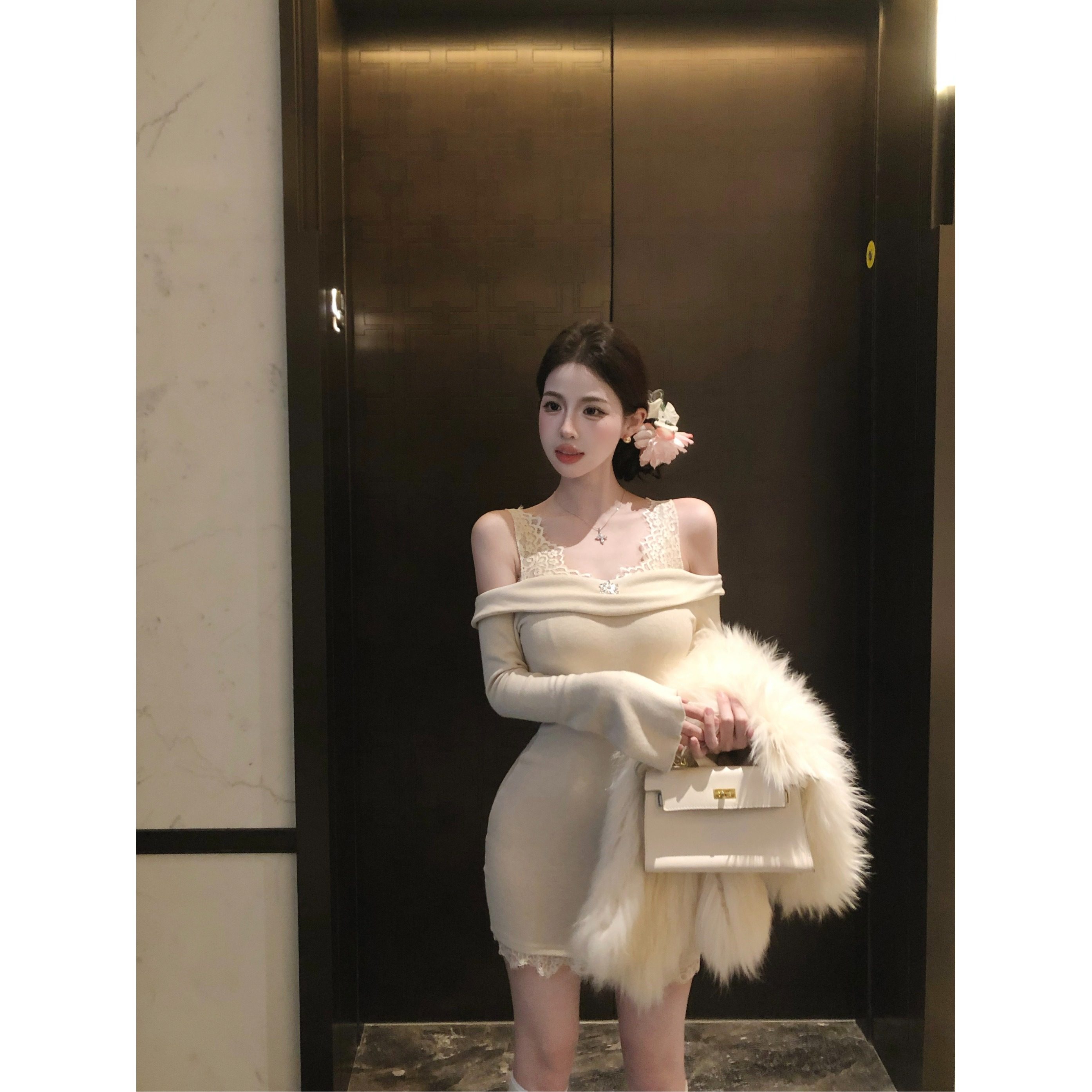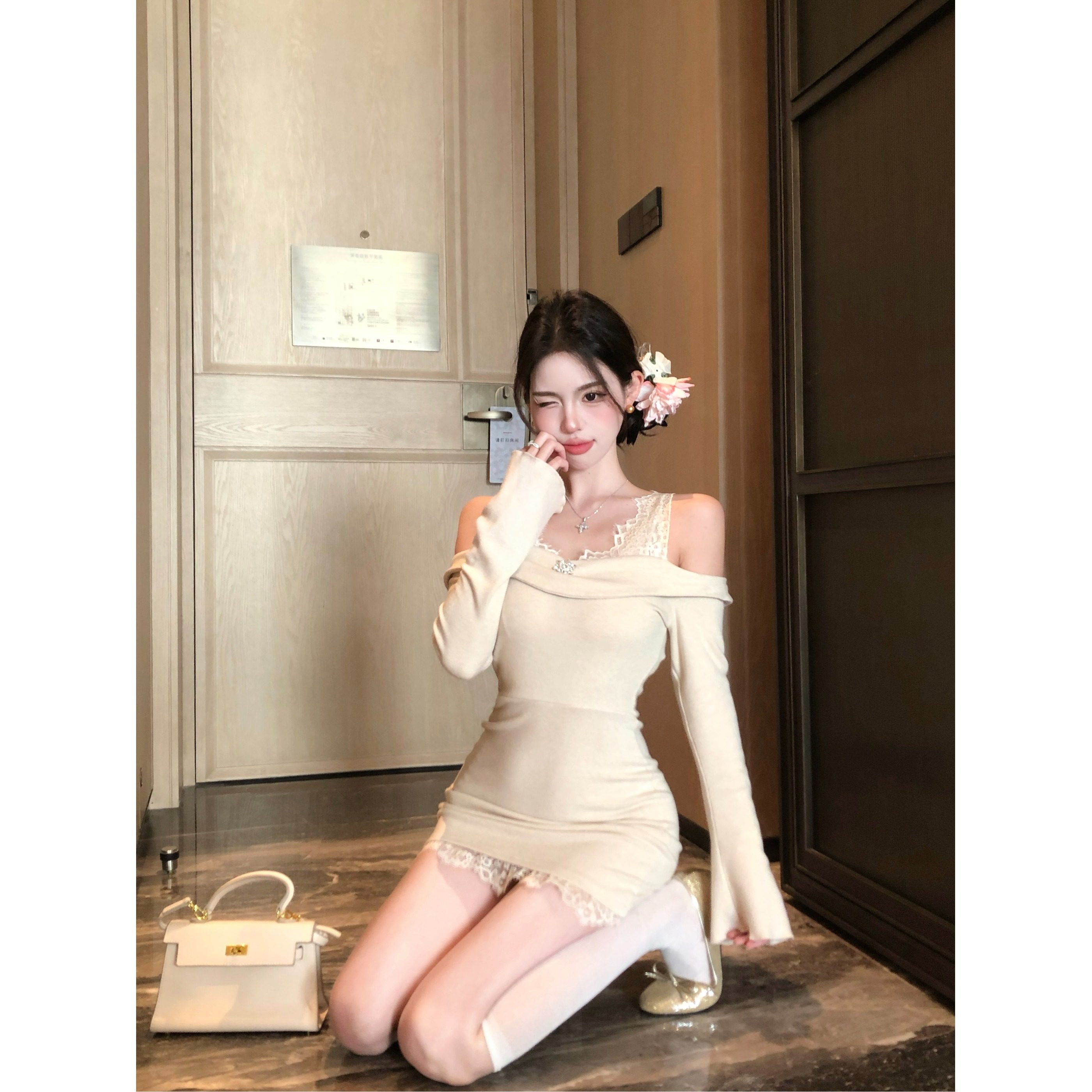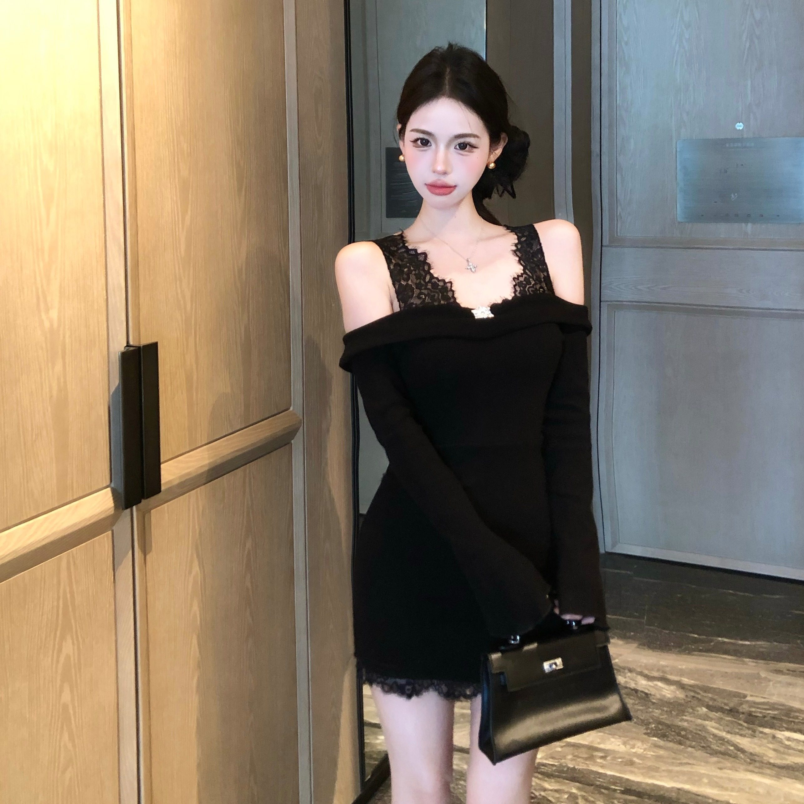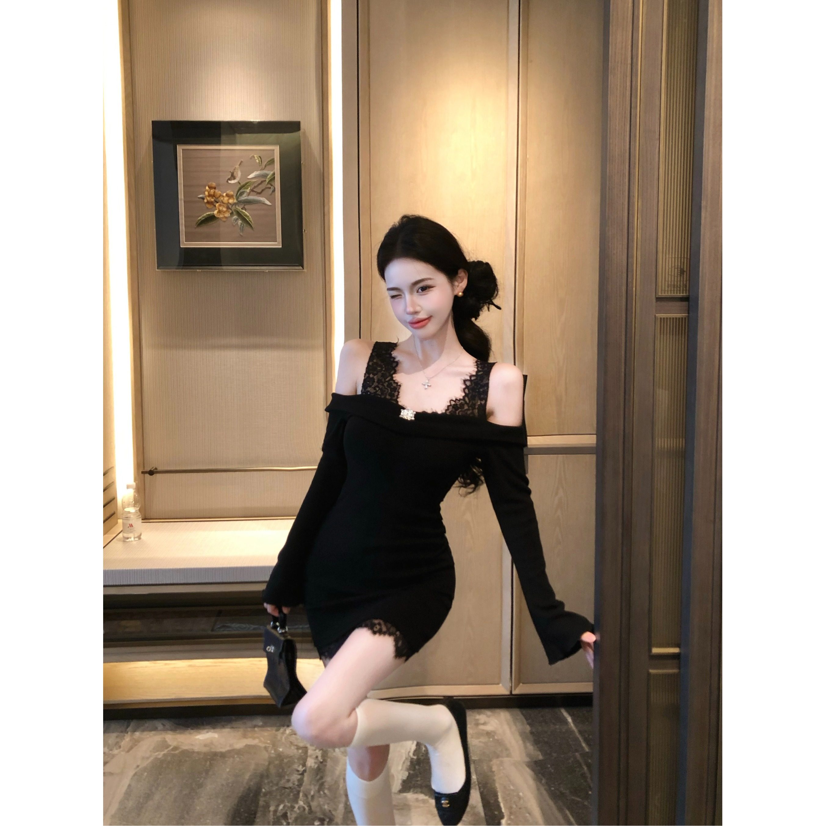 性感蕾丝拼接假两件长袖 设计纯欲一字领包臀短裙 连衣裙女秋冬新款