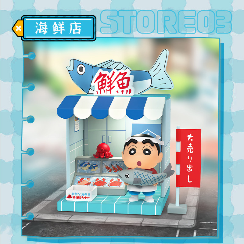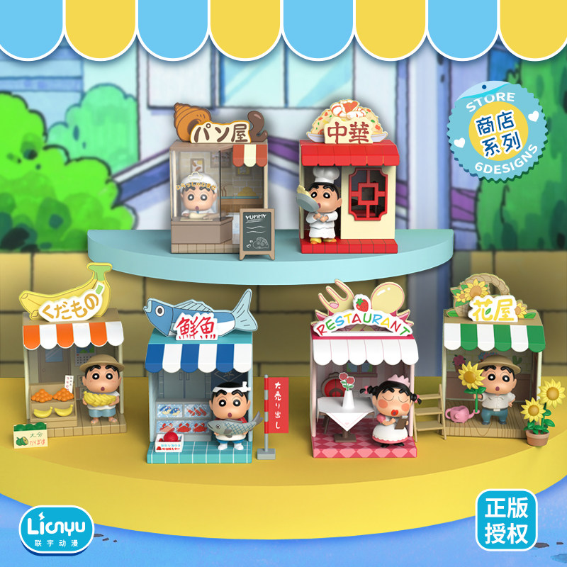 正版 联宇动漫蜡笔小新商店街盲盒海鲜店小摊可爱公仔发光桌面摆件