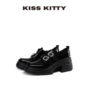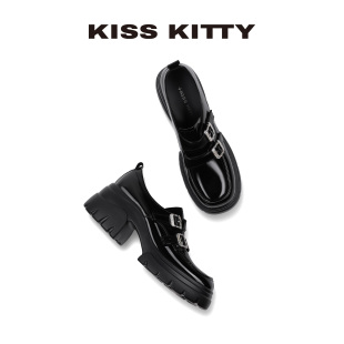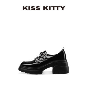 黑色百搭高跟深口单厚底英伦乐福鞋 KISSKITTY小皮鞋 女小个子新款