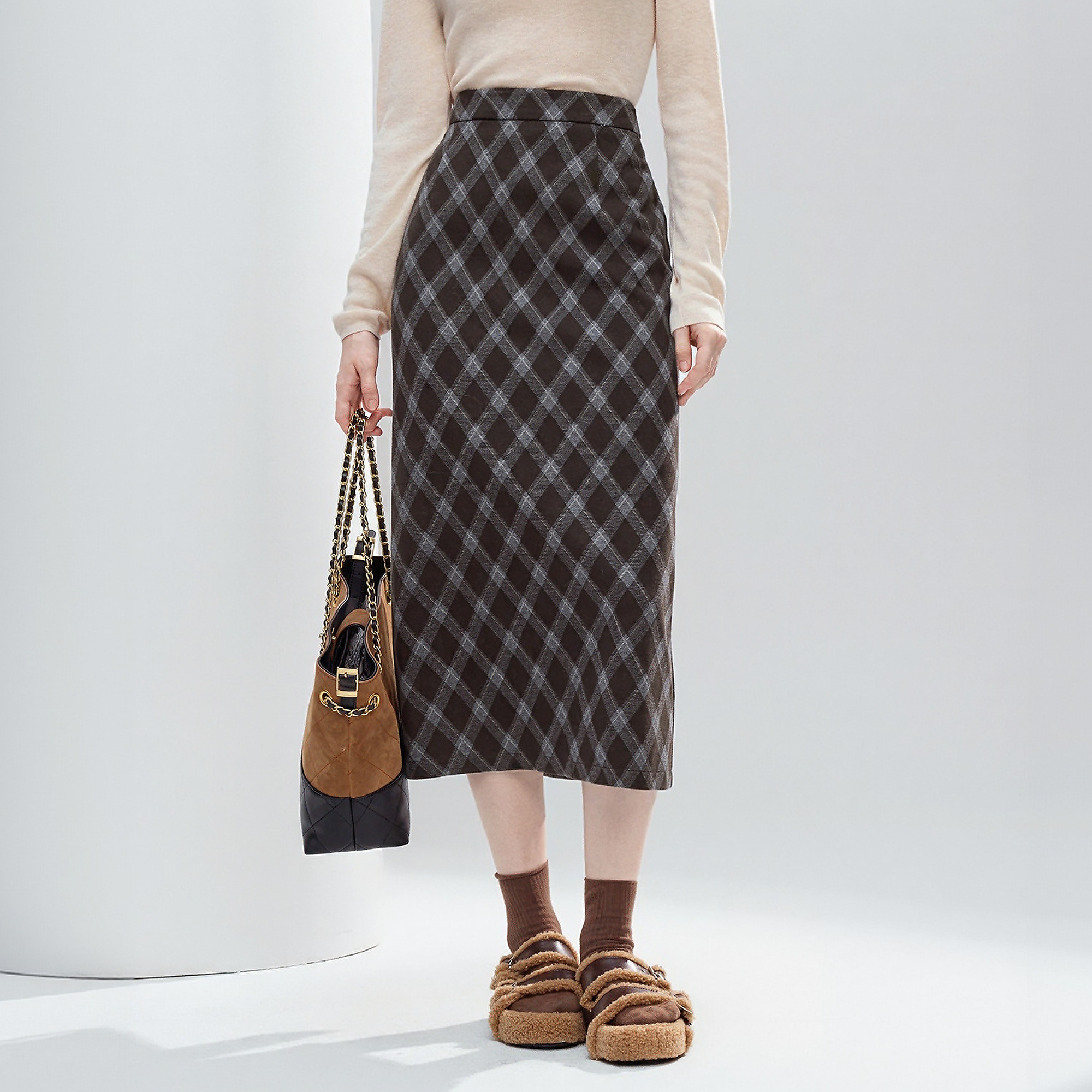 直筒裙 显瘦中长款 betu百图复古格子毛呢半身裙女2025年冬季 新款