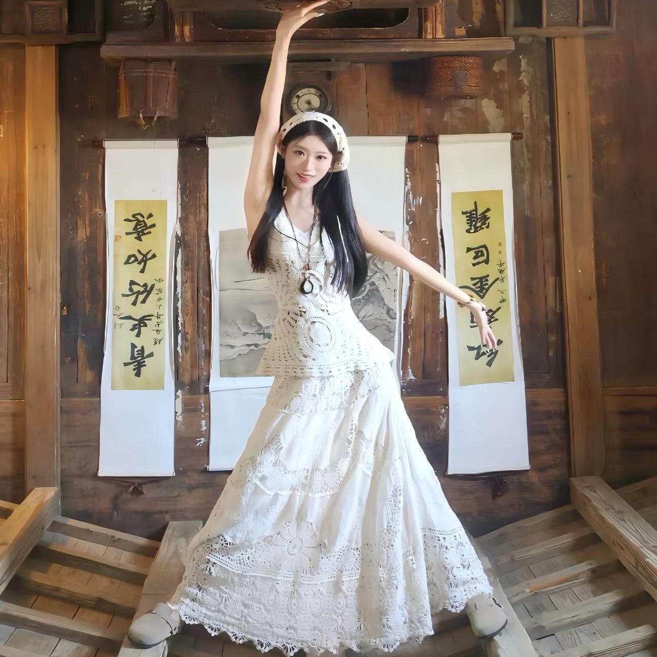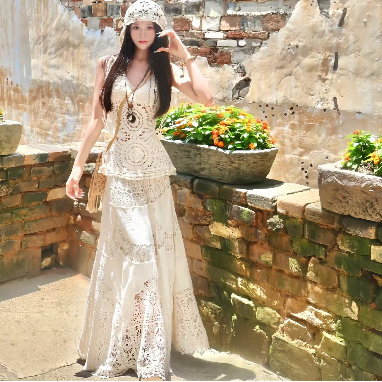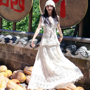 法式 温柔蛋糕裙海边度假连衣裙女夏收腰显瘦气质棉麻a字中长裙