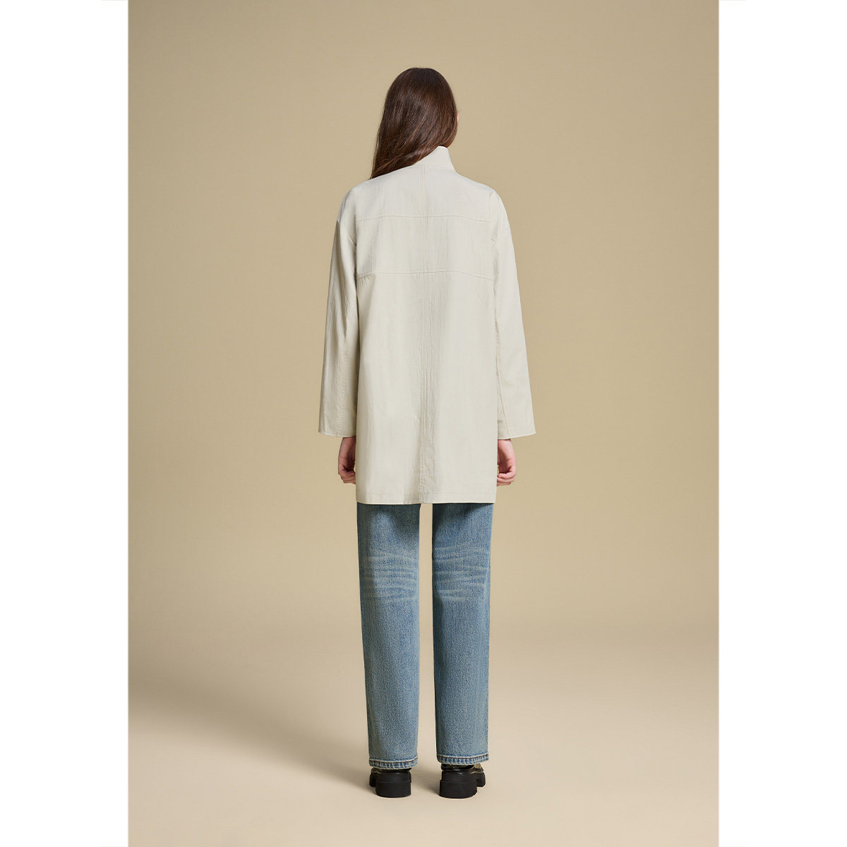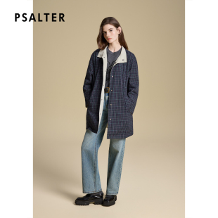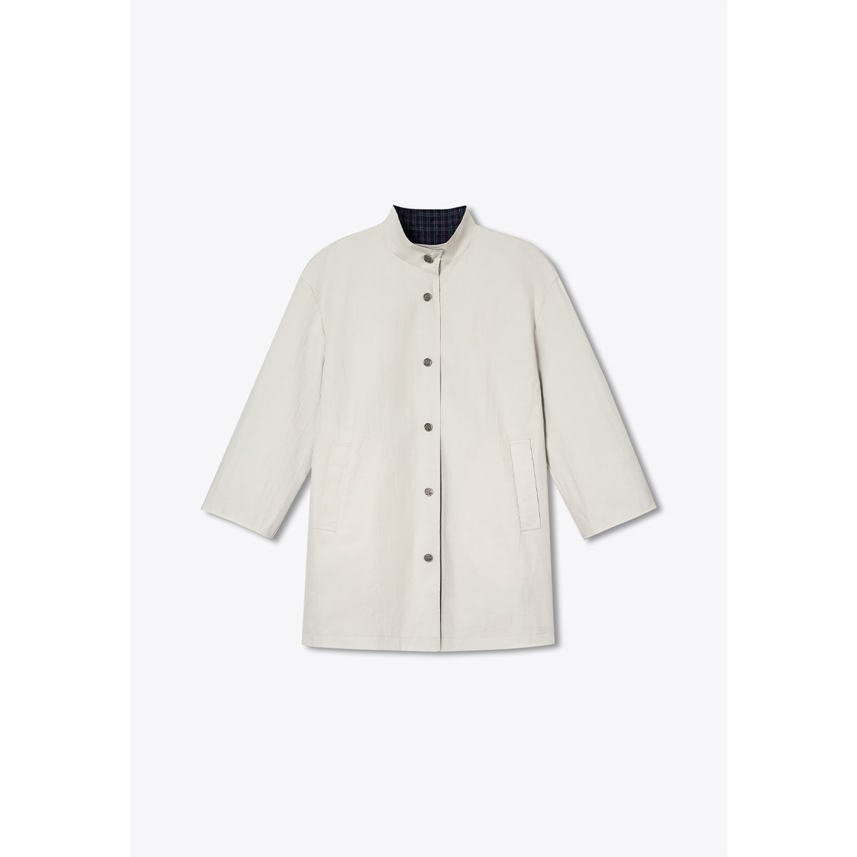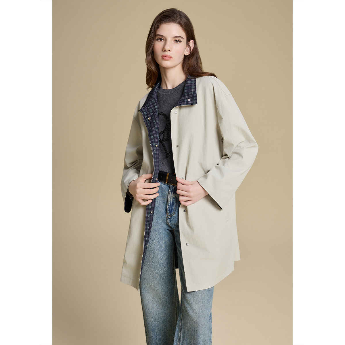 诗篇专选双面穿格纹立领宽松休闲中长款 简约风衣外套