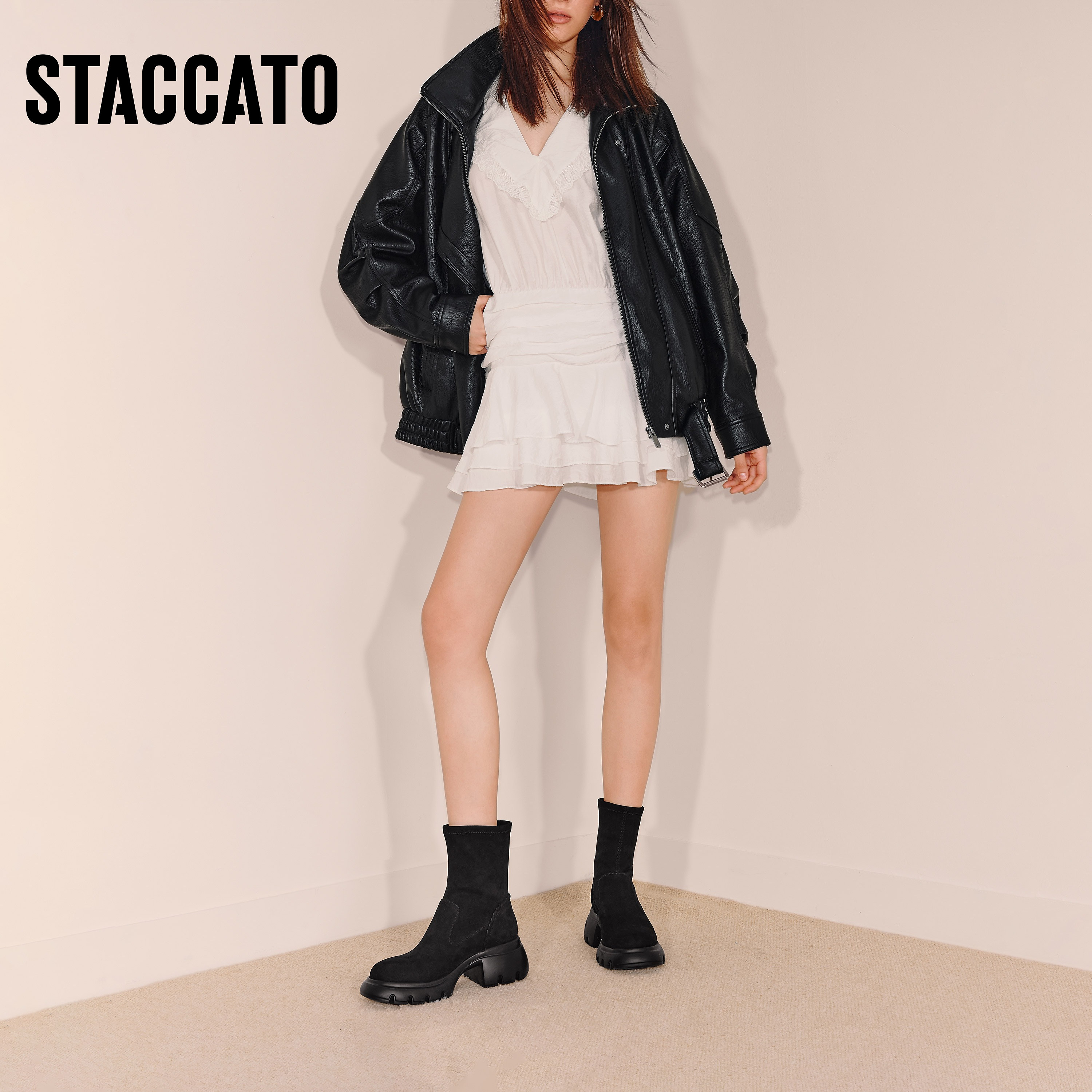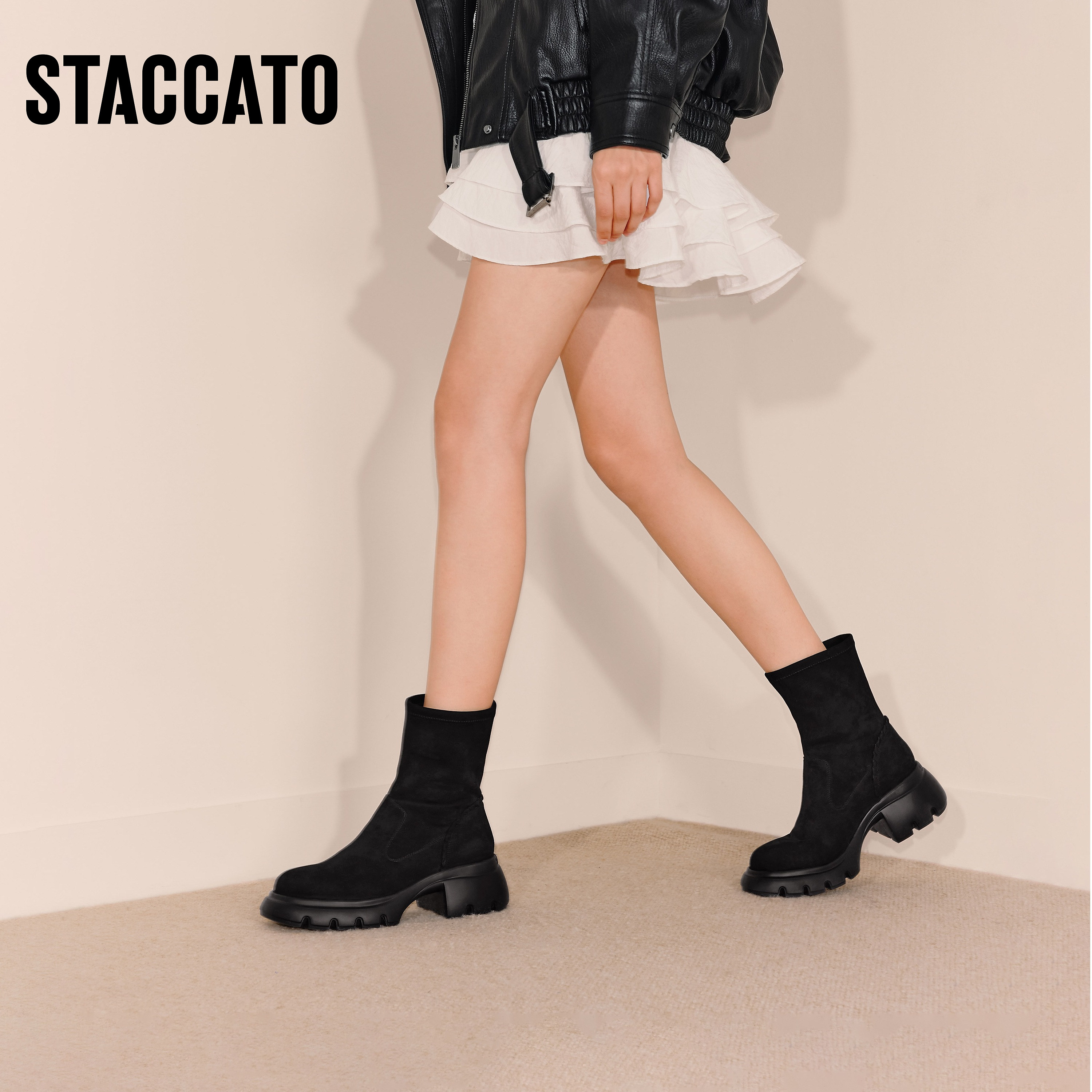 思加图2025冬季 通勤弹力靴瘦瘦靴中靴厚底增高女靴子Y2563DZ5 新款