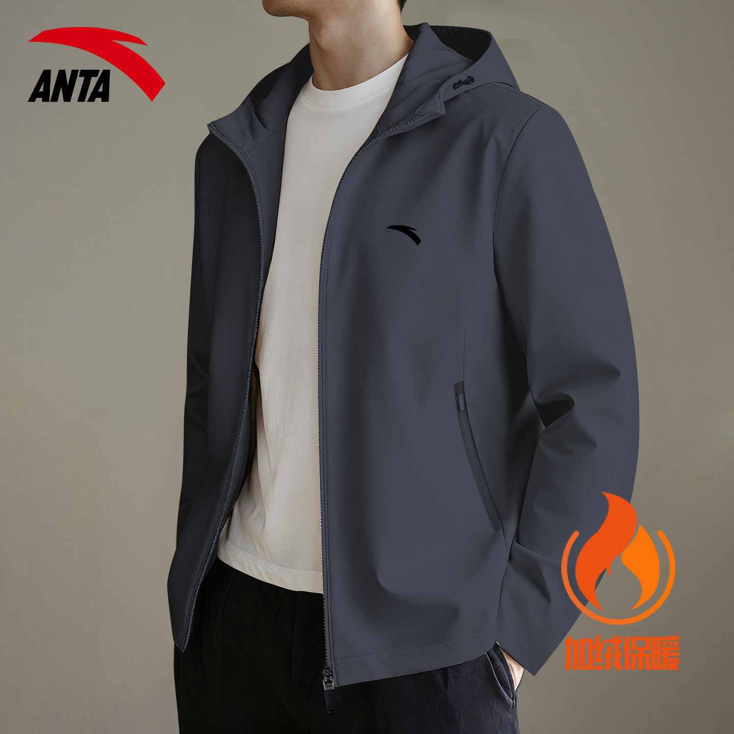 安踏加绒保暖外套男秋冬季 连帽软壳夹克 运动休闲风衣黑色宽松开衫
