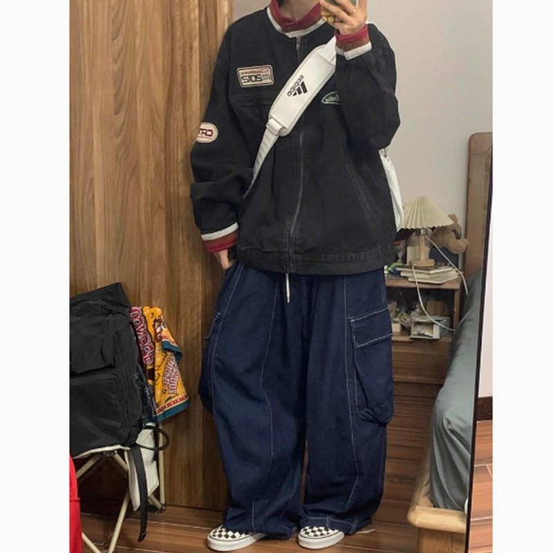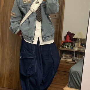 裤 CulturE小众复古做旧牛仔套装 夹克外套废土重磅拉链大口袋工装
