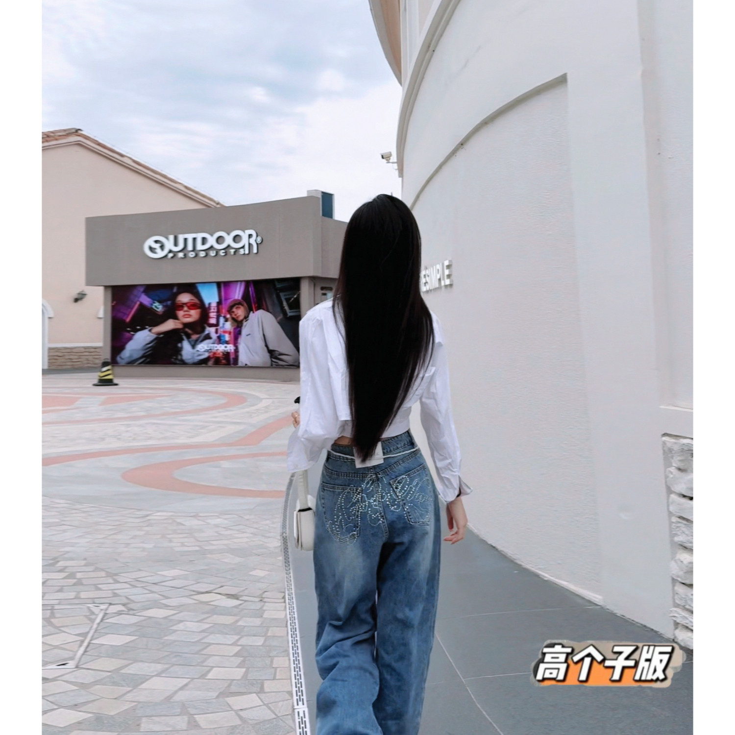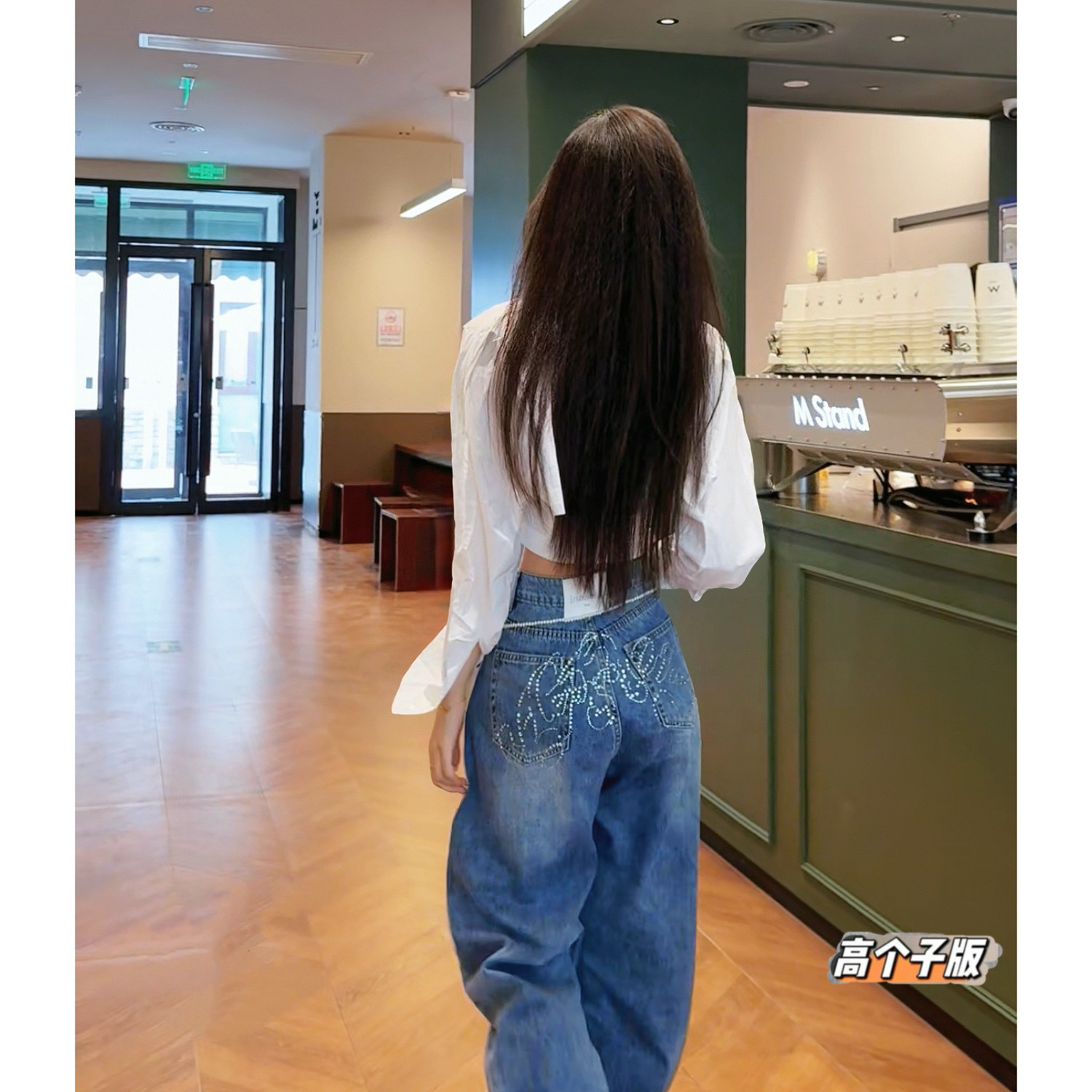 女弯刀宽松阔腿裤 复古字母烫钻高腰牛仔裤 秋冬美式 猫猫家加长女裤
