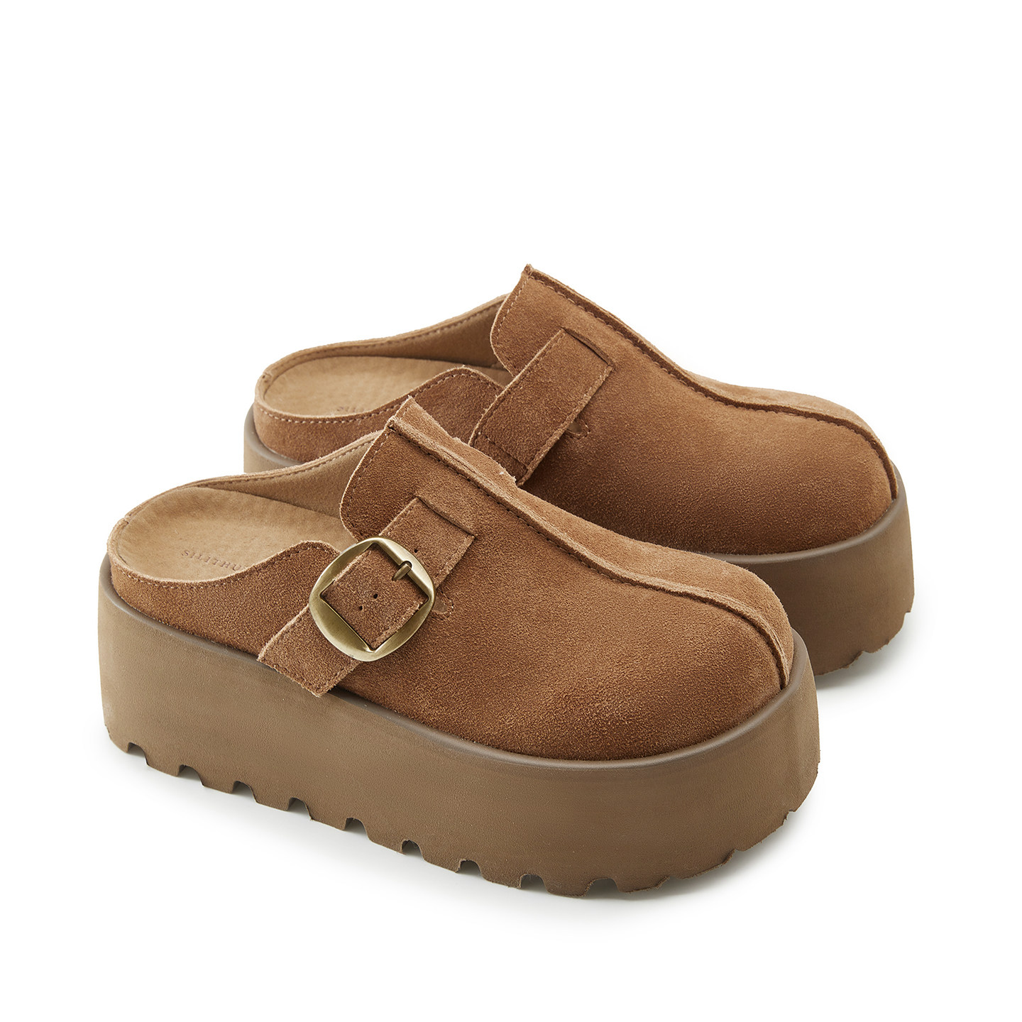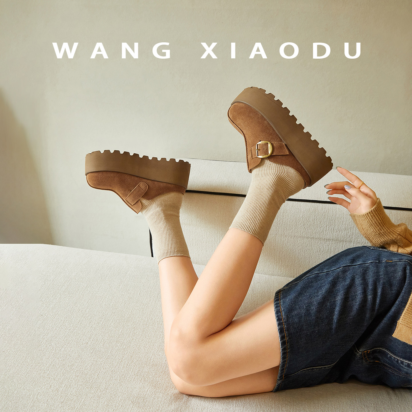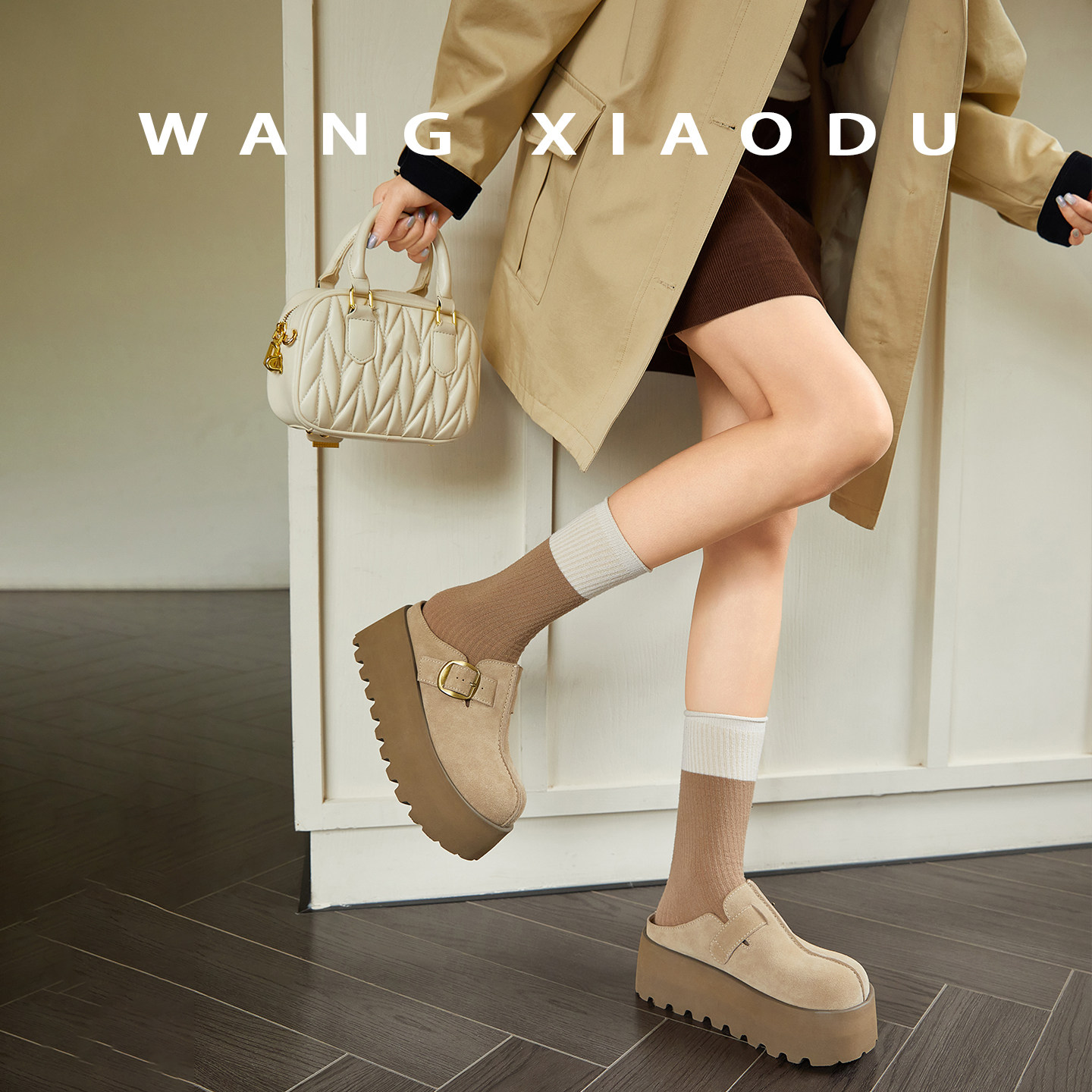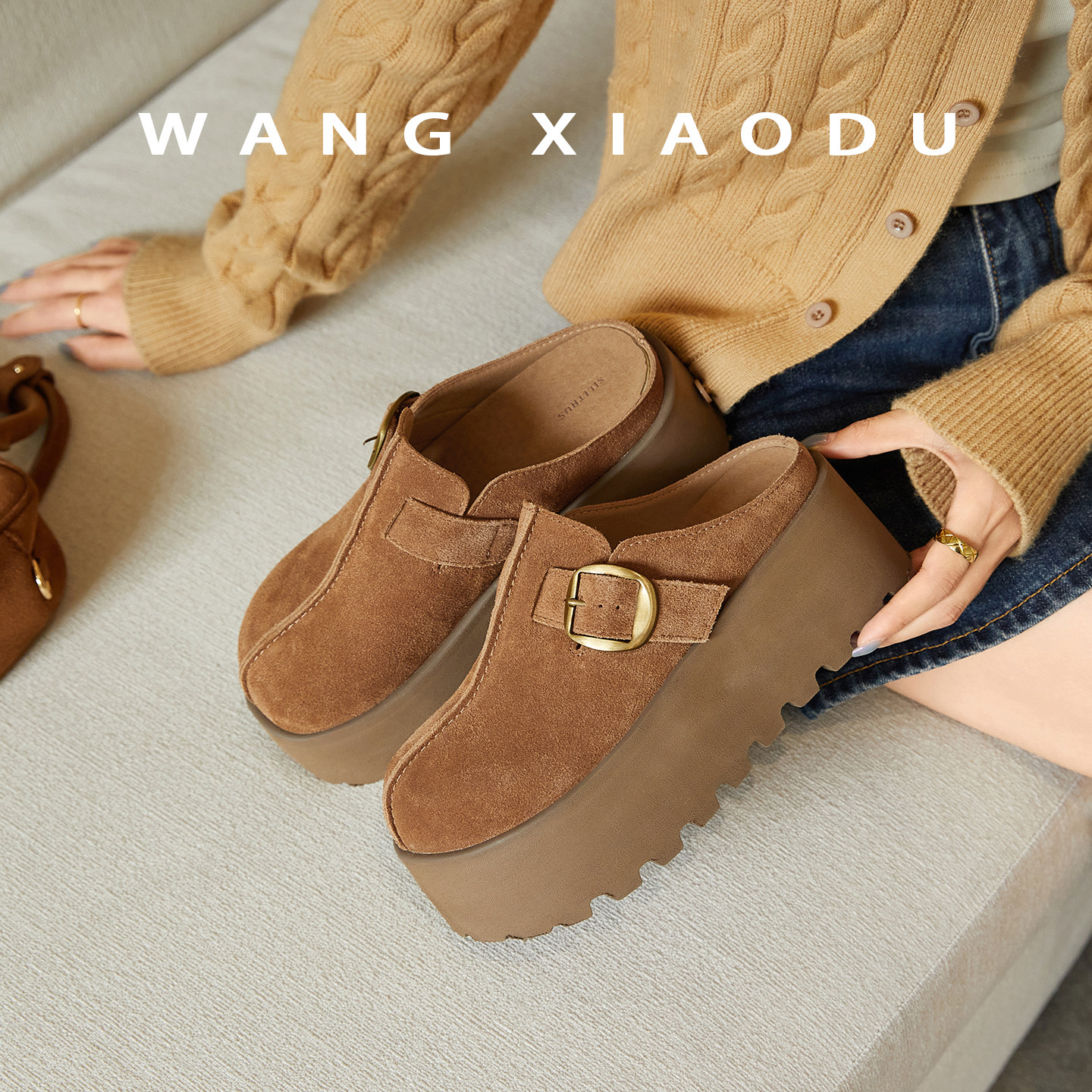 6.5cm厚底勃肯拖鞋 栗秋 女秋冬绒面魔术贴半拖包头拖 王小毒