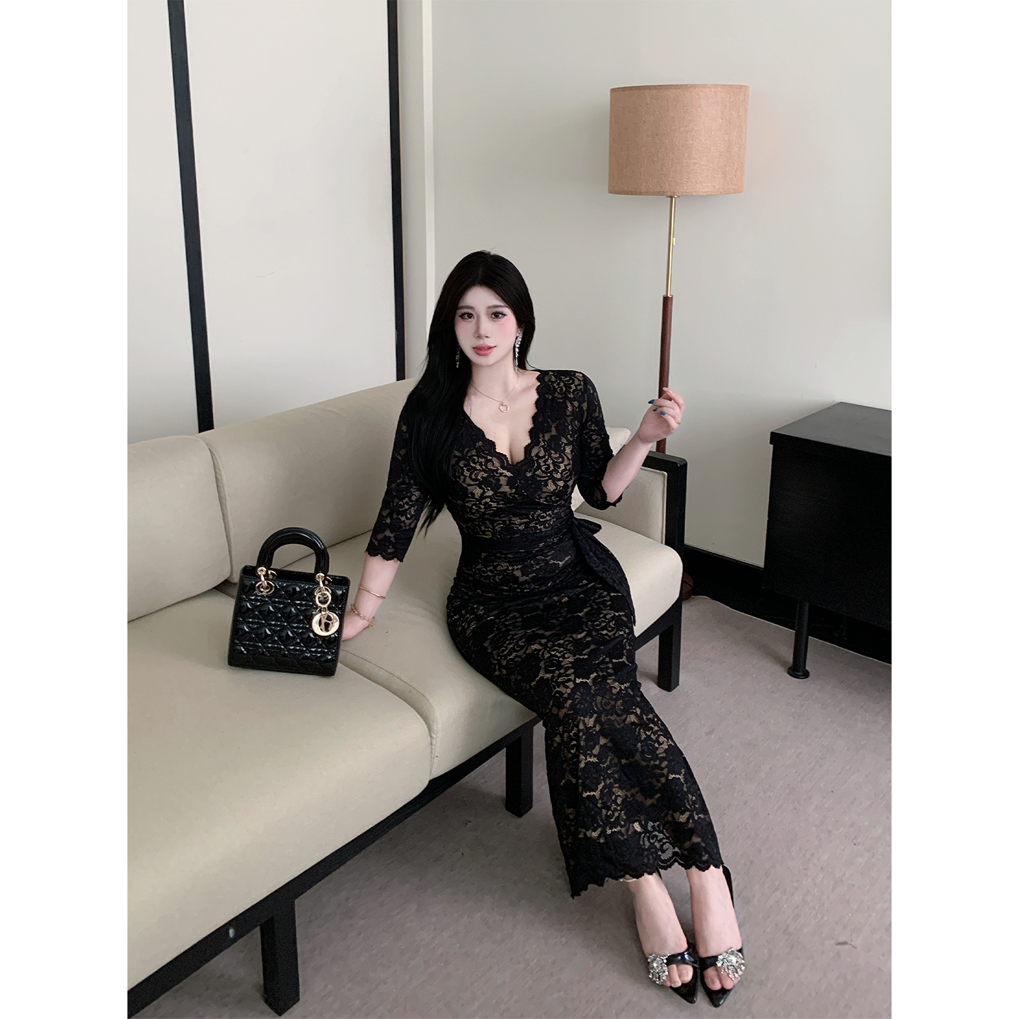 Bbabes 性感纯欲镂空蕾丝连衣裙微胖收腰显瘦包臀裙 槐南一梦