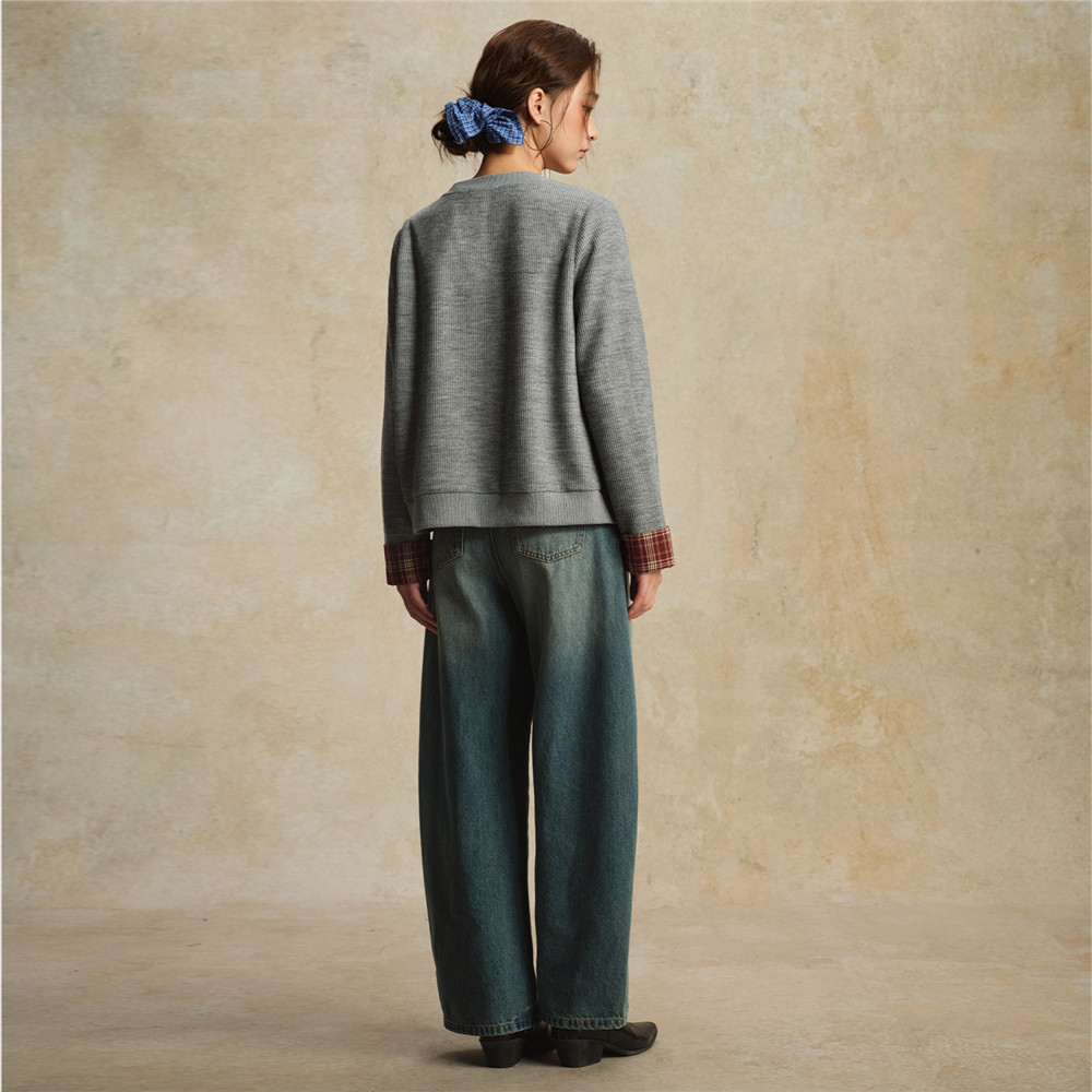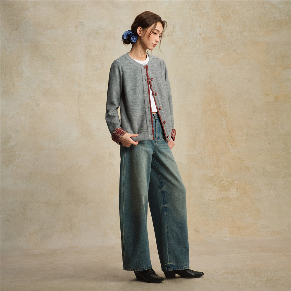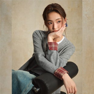 假两件拼接格纹圆领开衫 设计师款 新款 春季 18375211 佐丹奴外套女装