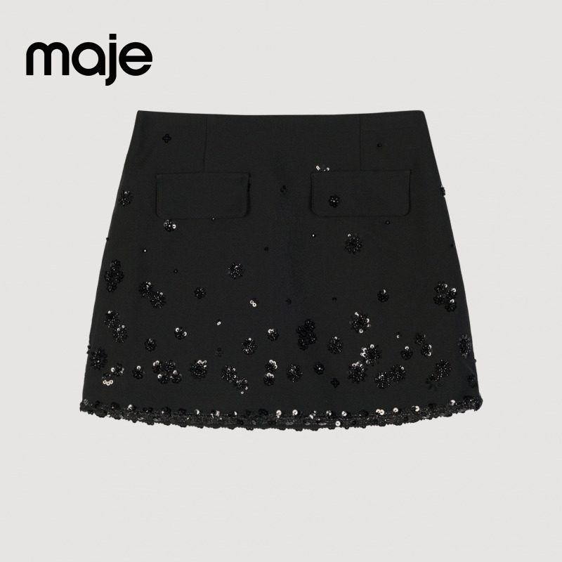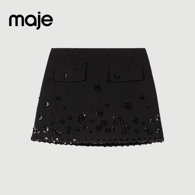 法式 女装 气质时尚 黑色花卉亮片装 季 饰A字短裤 末7折Maje2025秋冬款