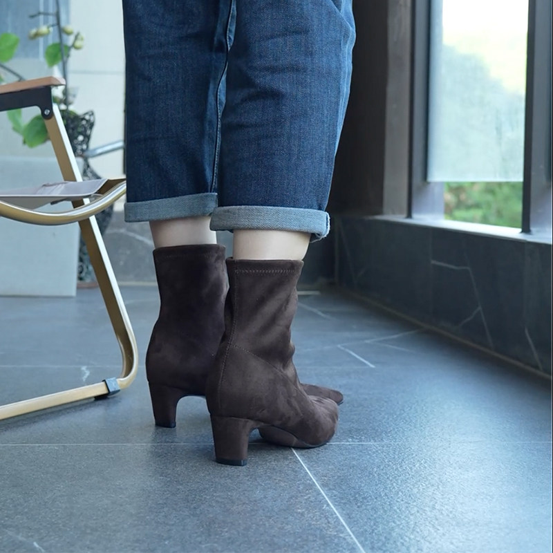 百丽画廊假日加绒时装 弹力靴反绒面粗高跟显瘦瘦短靴子BBWB1DZ5