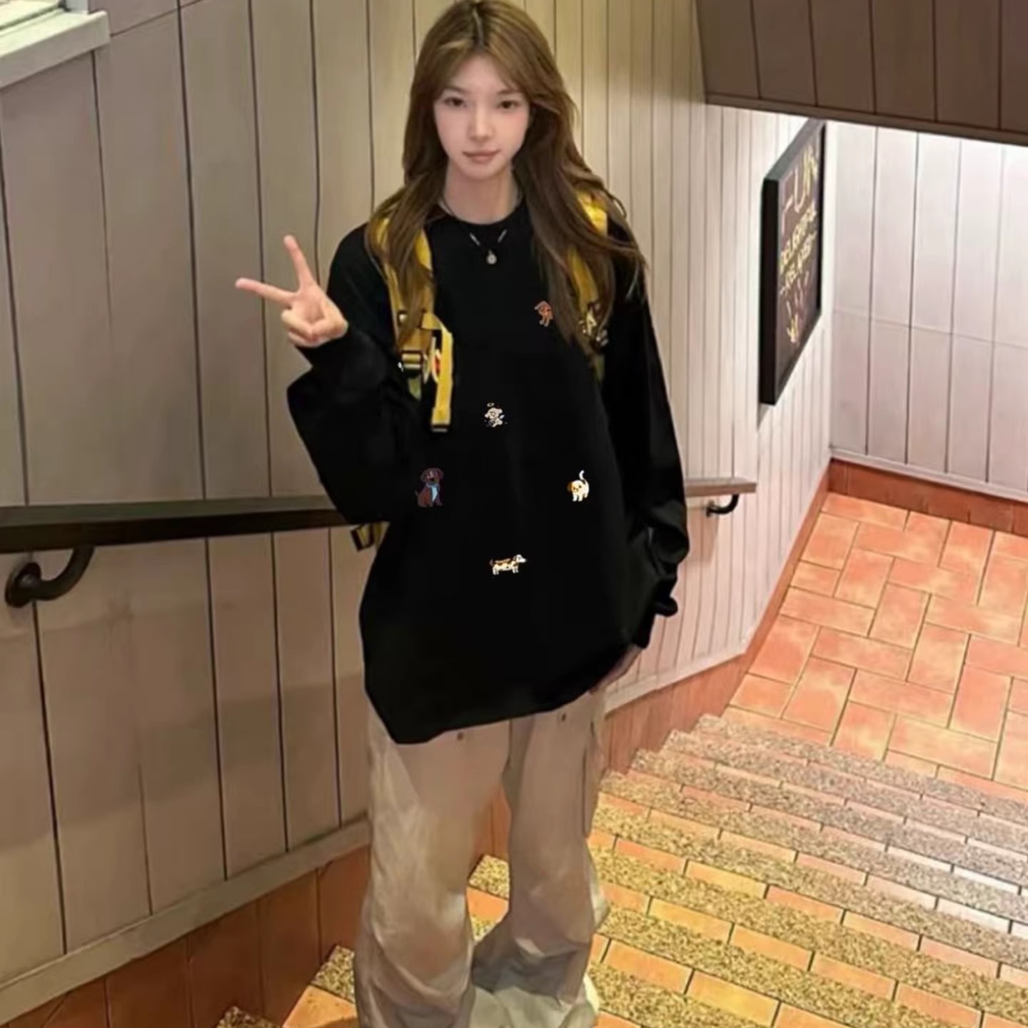 设计感小众宽松慵懒风早秋上衣情侣装 T恤女秋季 高街纯棉长袖 美式