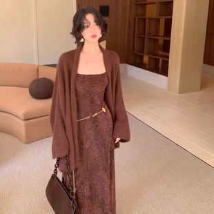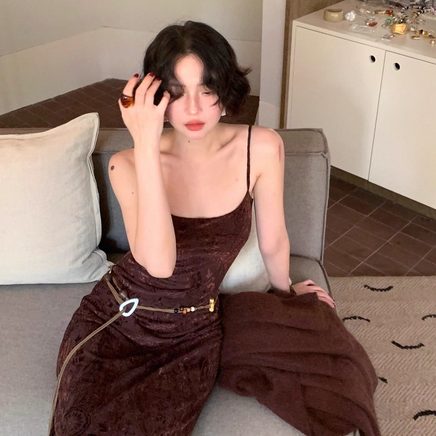 弹力丝绒网纱长款 港风复古秋季 吊带连衣裙女 琥珀松林 酒午自制
