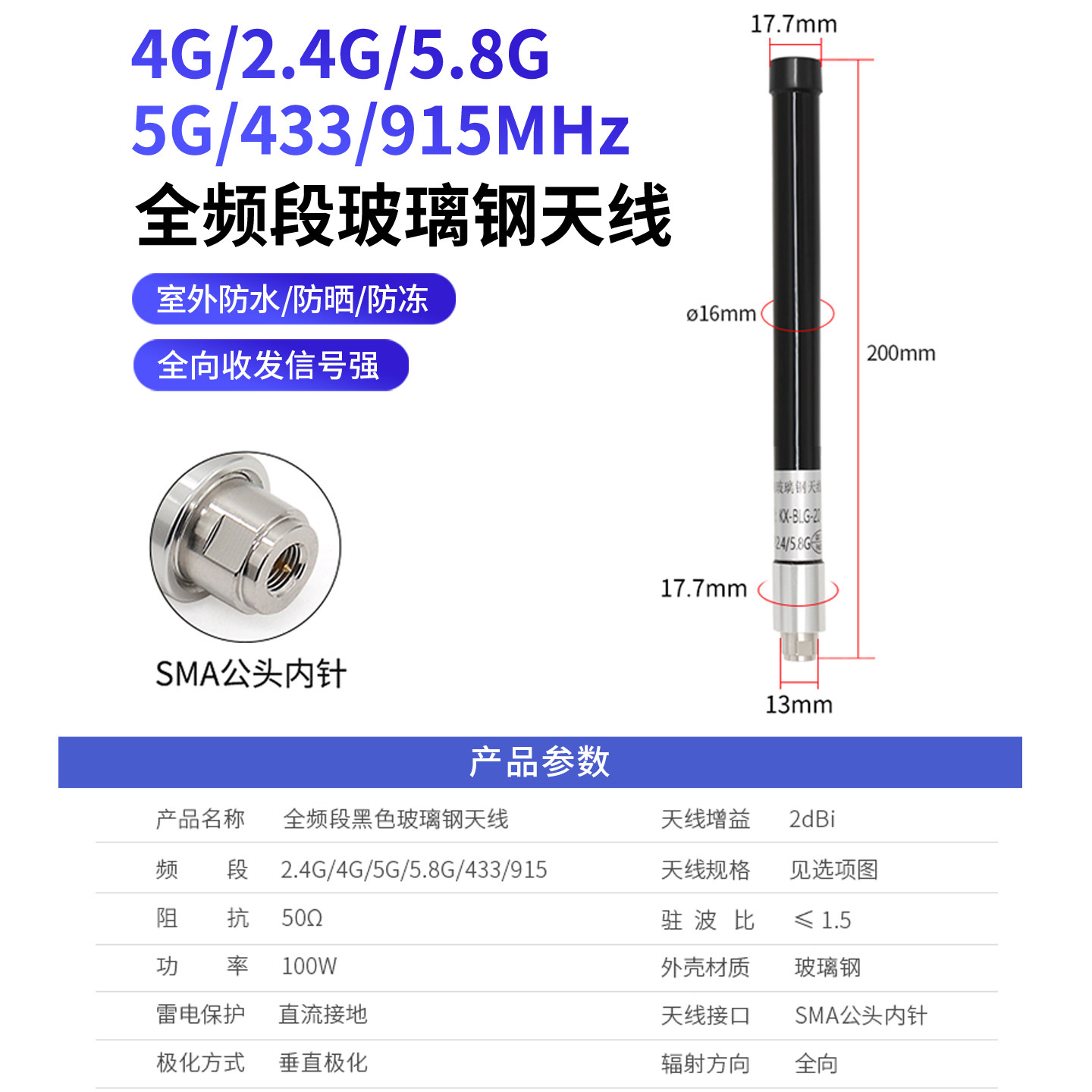 433 2.4G 915mhz全向防水AP基站信号增强玻璃钢天线 5.8G