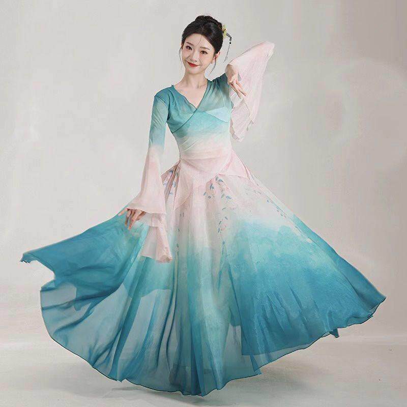 古典舞服装 身韵海棠花渐变晕染网纱上衣大摆裙中国舞蹈演出练功服
