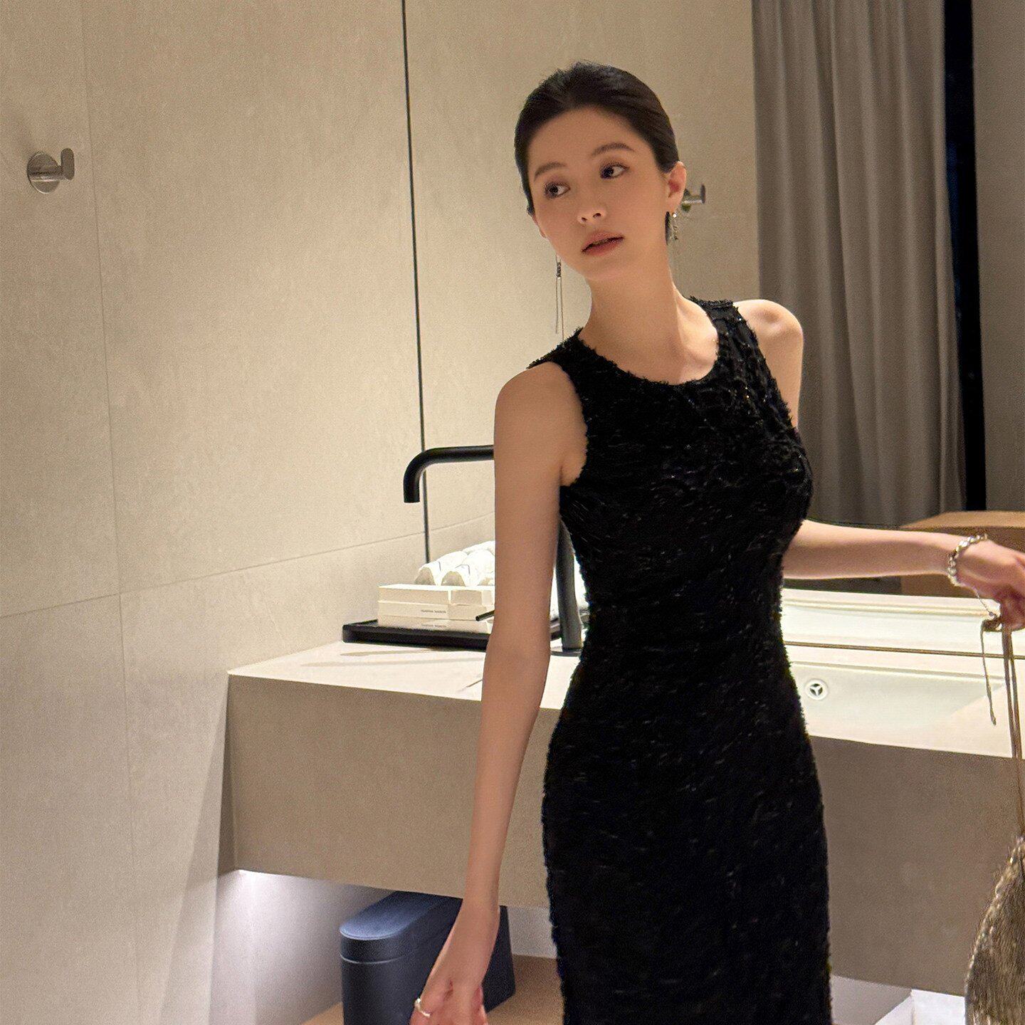 收腰背心连衣裙长裙女春新款 ADA 修身 无袖 MISS气质亮丝流苏削肩袖