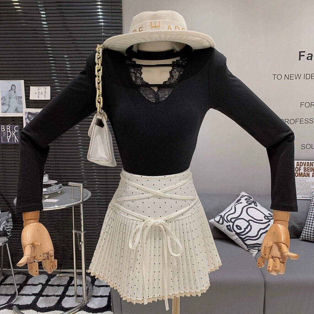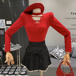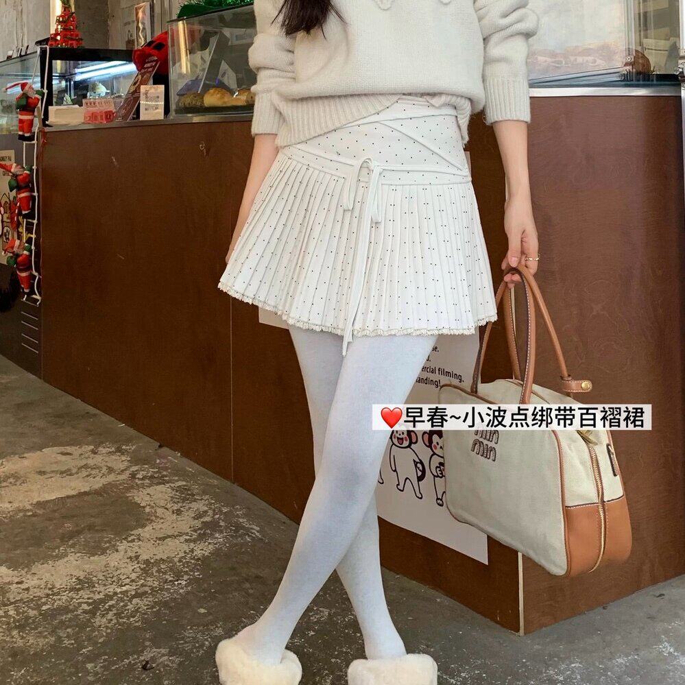 蝴蝶结系带红色波点半身裙春夏季 高腰百褶裙子a字短裙 防走光裙裤