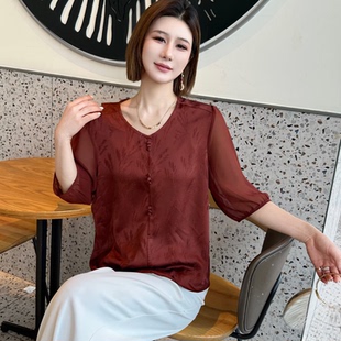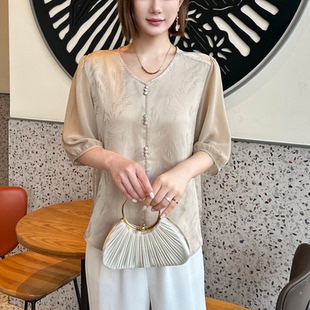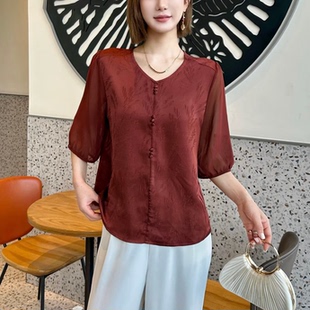 新款 夏季 真丝上衣T恤小衫 YWFF2030优雅气质国风纯色鸡心领女纱袖