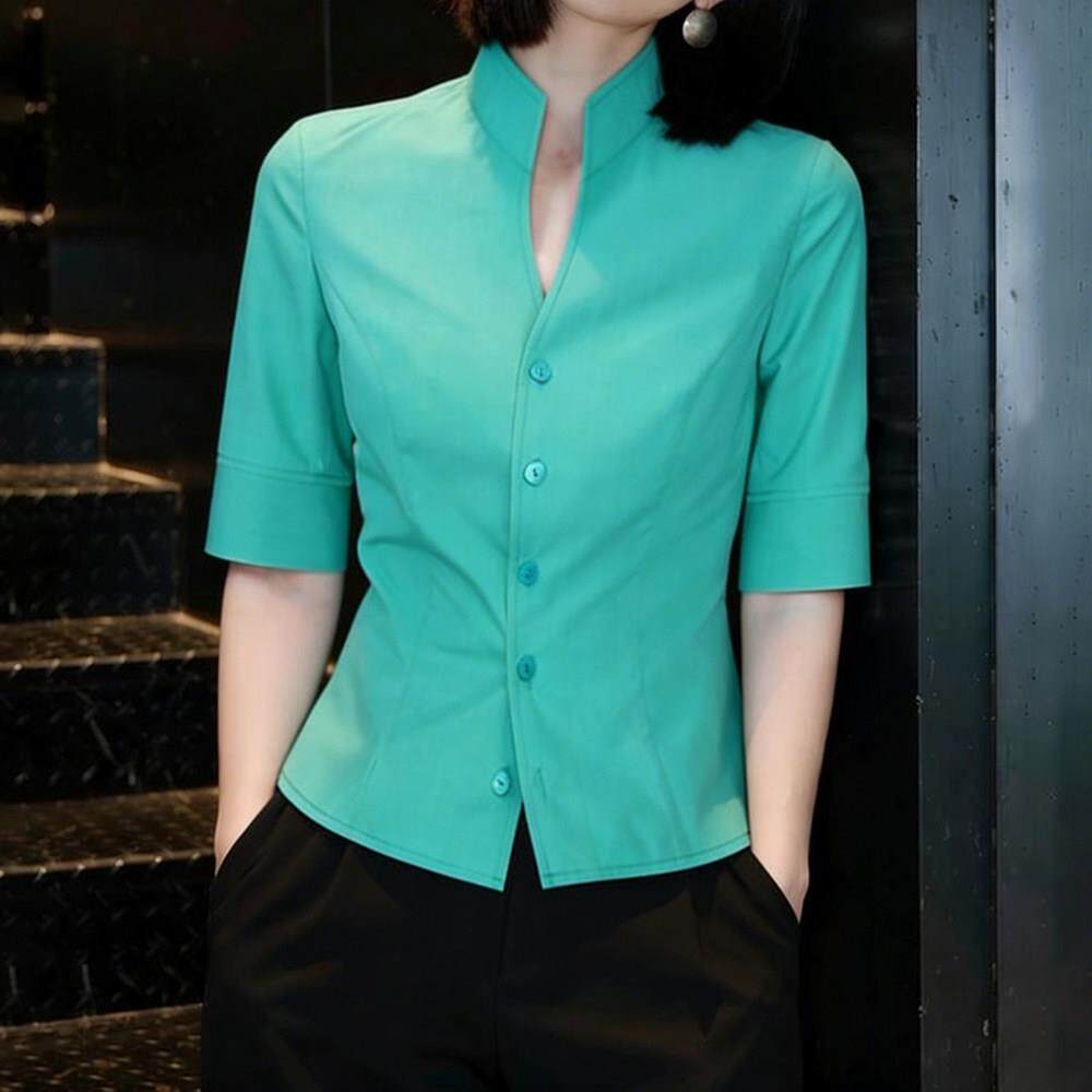 洋气减龄气质收腰显瘦0320z 女士2026新款 春夏绿色立领短袖 衬衫