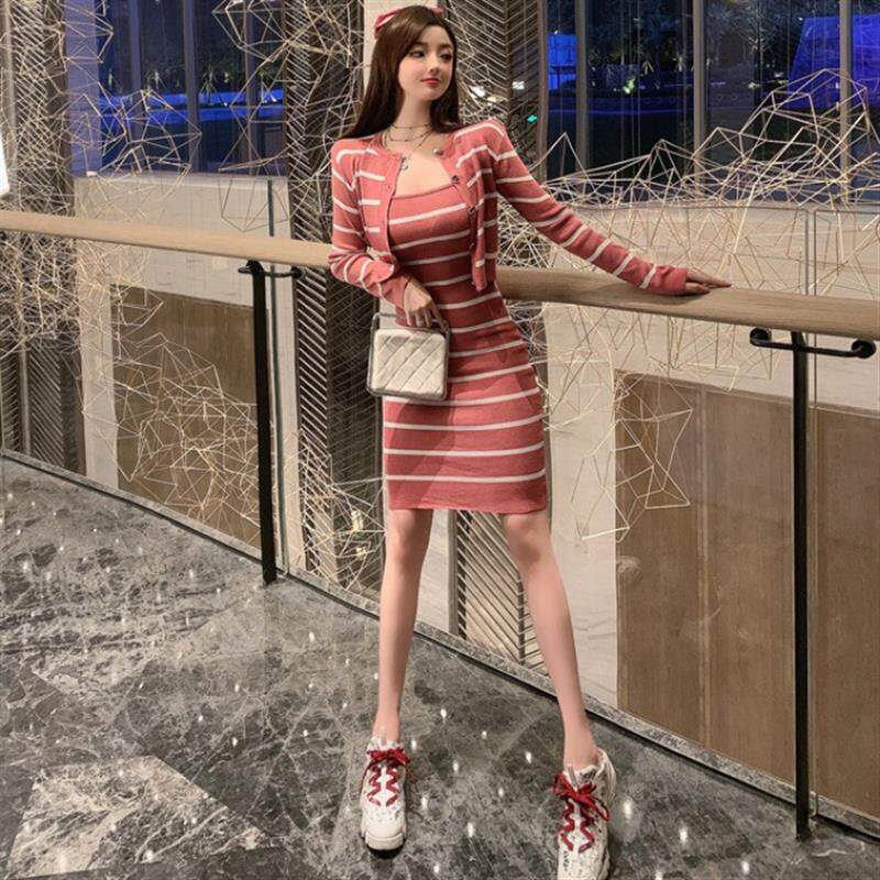 条纹长袖 短款 开 衫 包臀连衣裙针织两件 格格家 性感吊带修身 春季