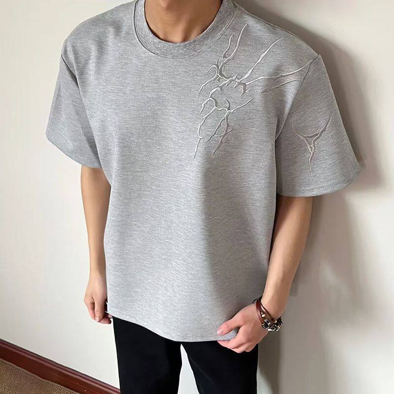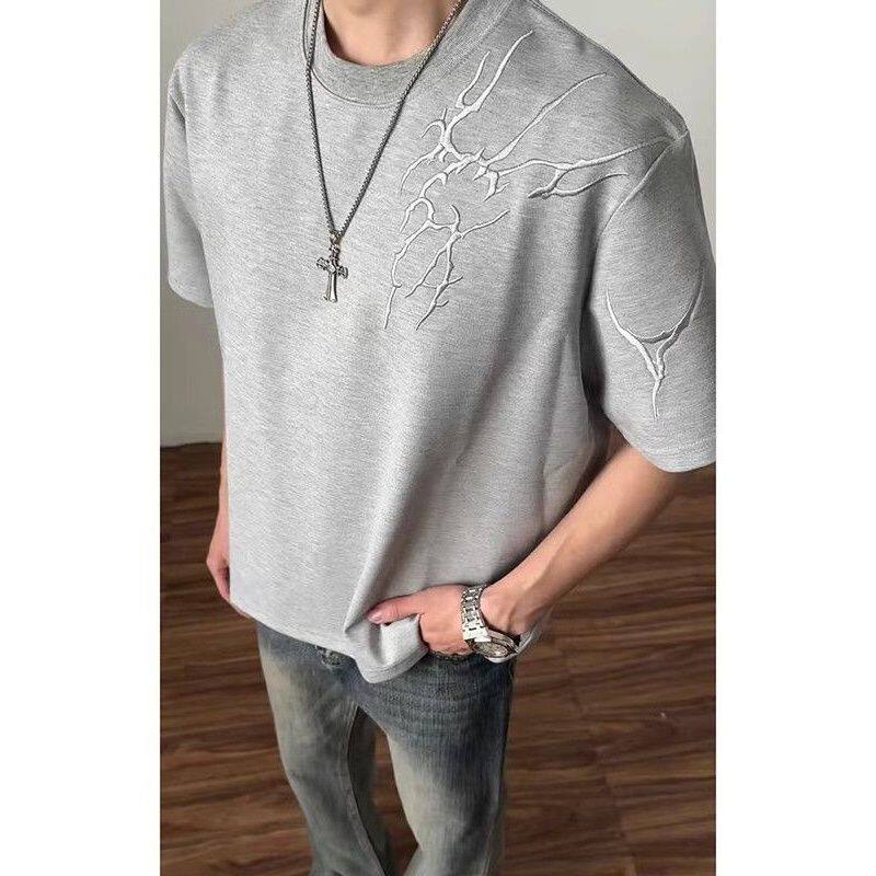 情侣半袖 特价 t恤男夏季 复古闪电刺绣短袖 圆领宽松上衣服 清仓美式