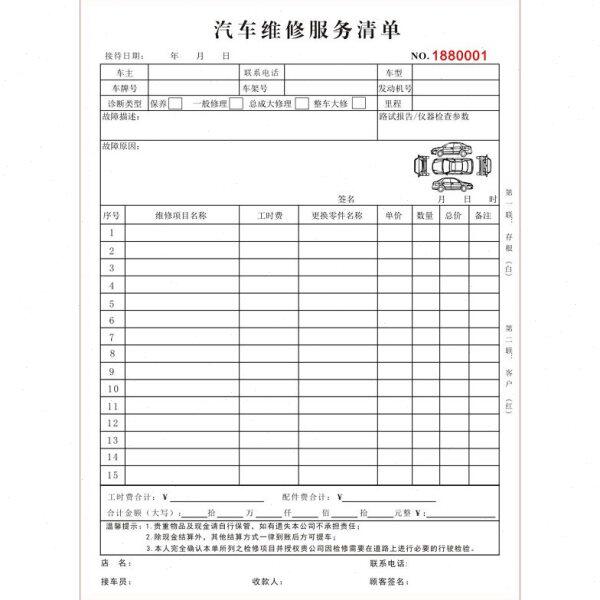 汽车维修服务结算单据二联汽车修理厂美容维修接车派工单表格订做