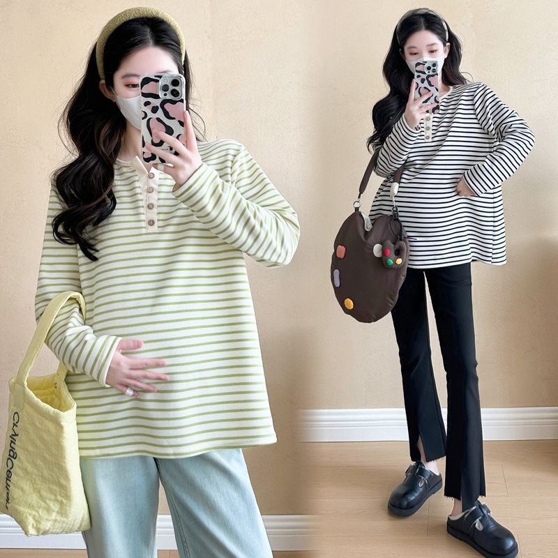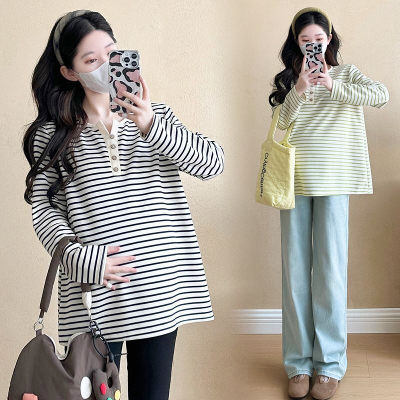 宽松大码 韩版 胖妹妹减龄休闲孕妇体恤上衣 T恤女春秋新款 条纹长袖