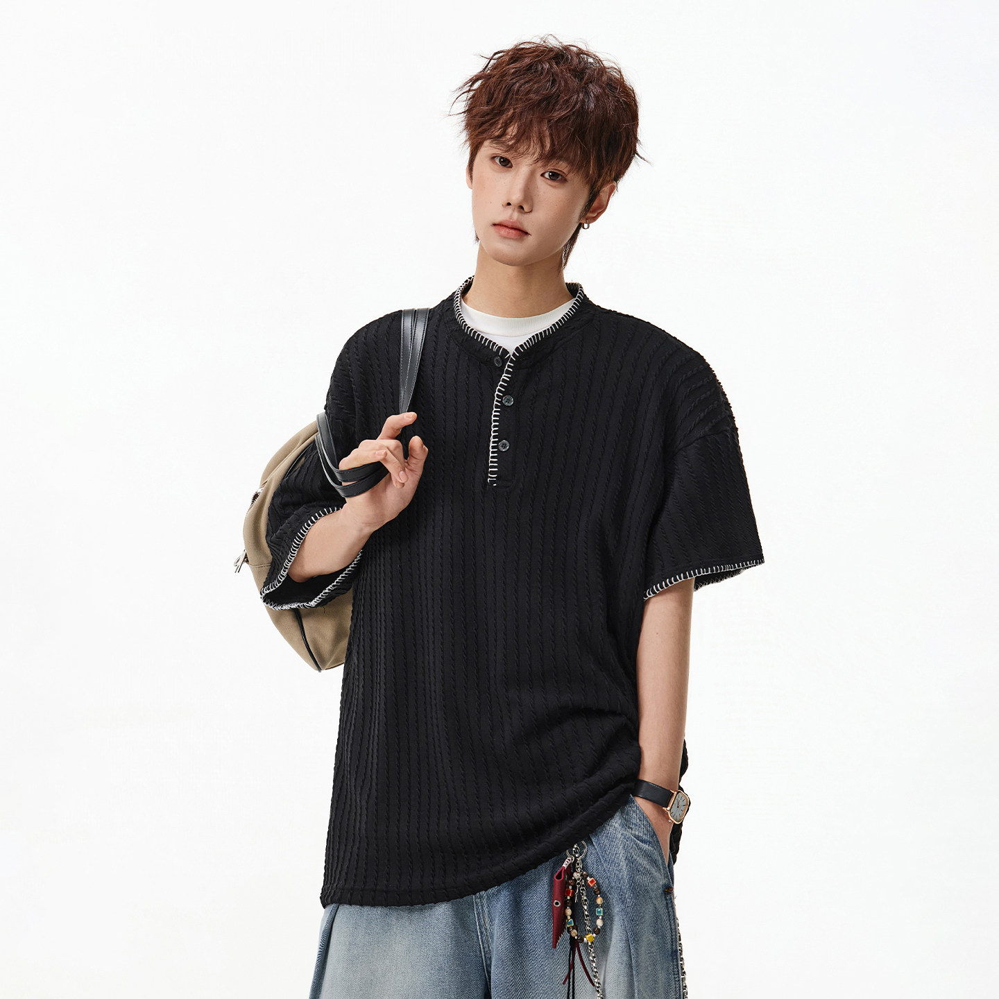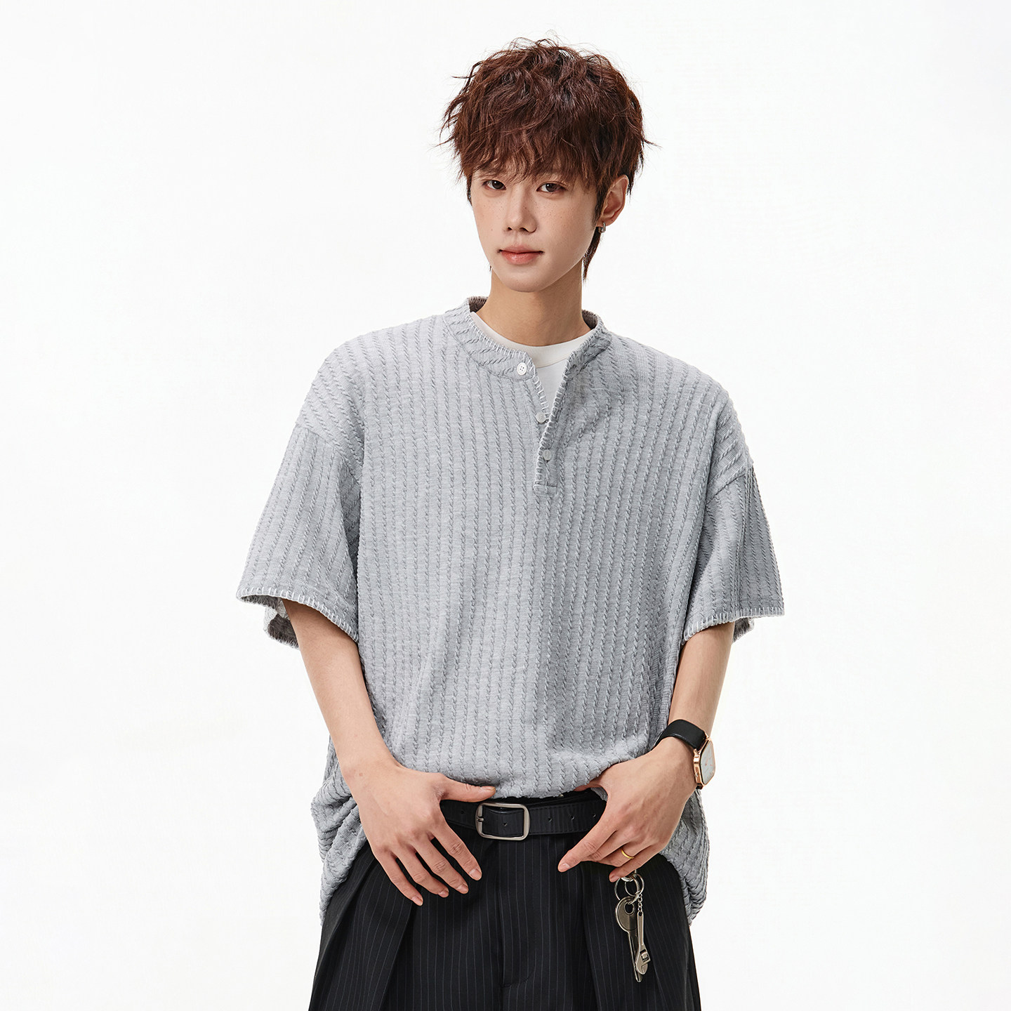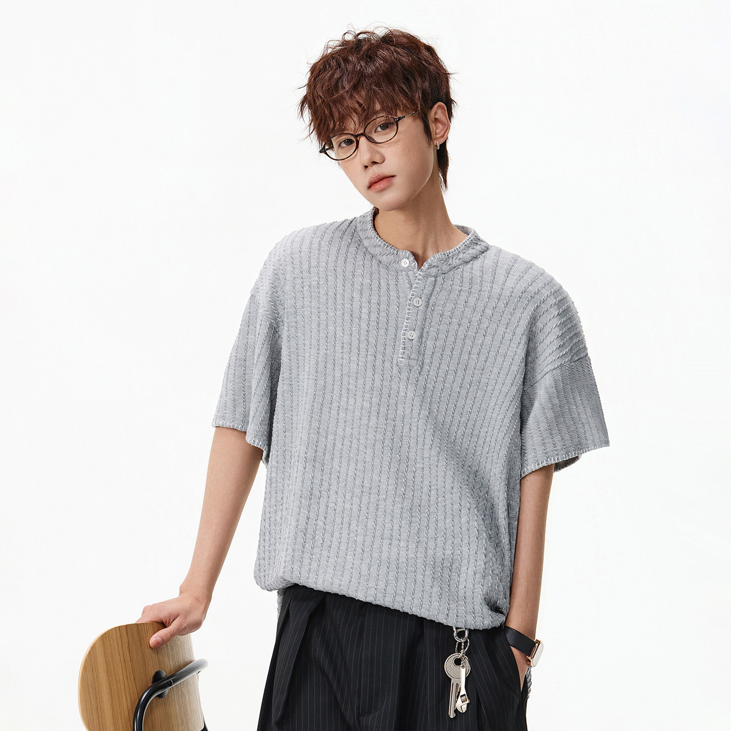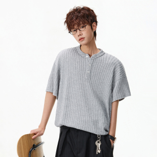 上衣夏季 STA美式 灰色针织宽松半袖 T恤男士 老钱风 休闲亨利领短袖