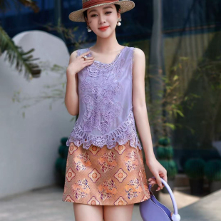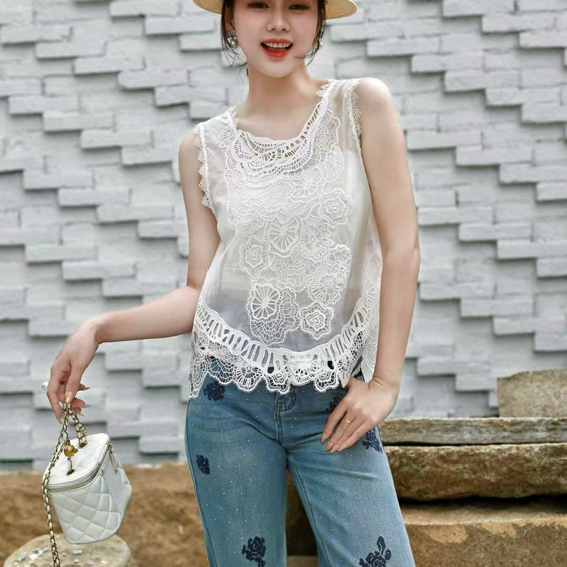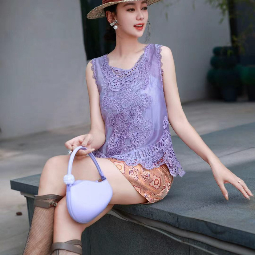 馨菲26年夏上新复古蕾丝拼接无袖 含5真丝 背心 X320234 短款