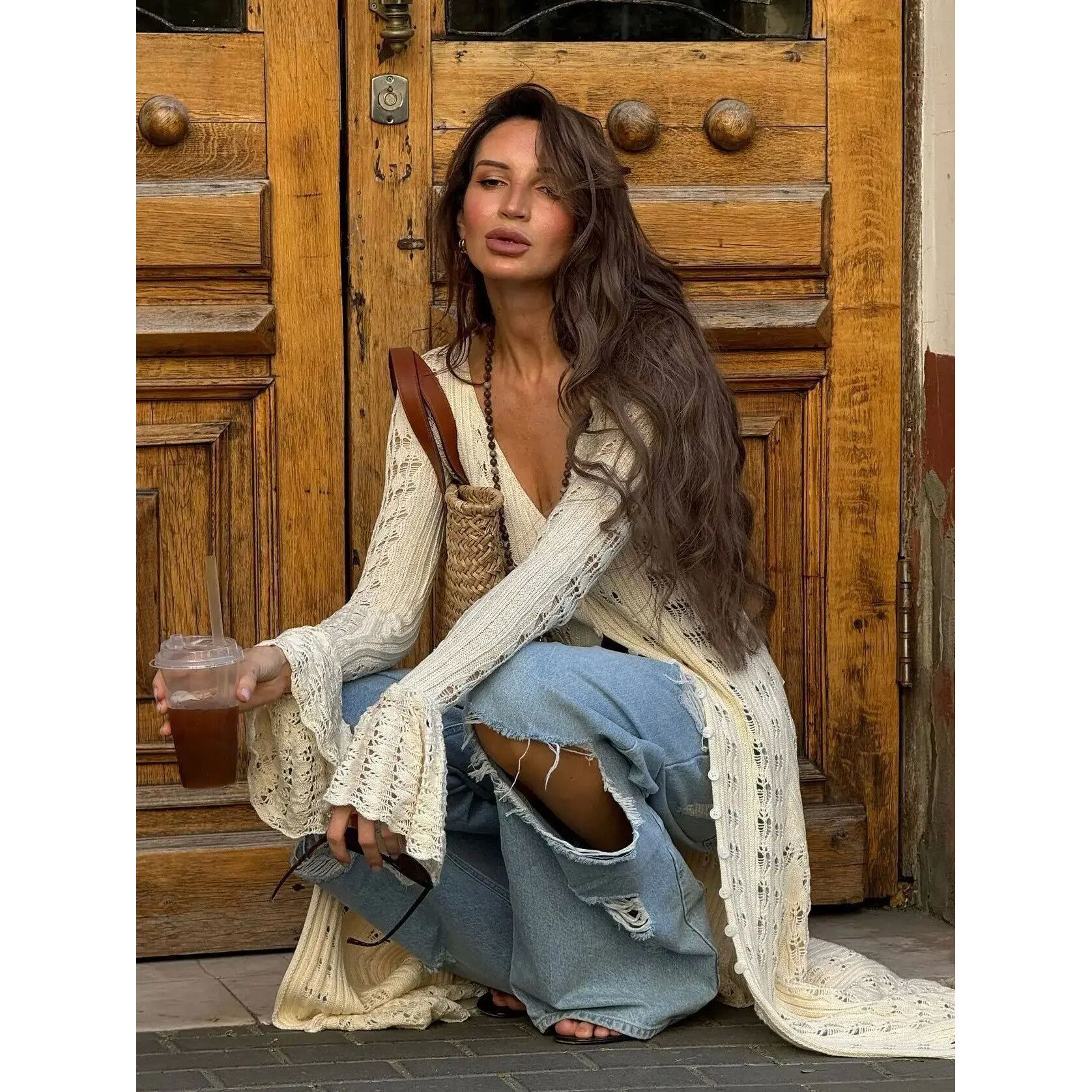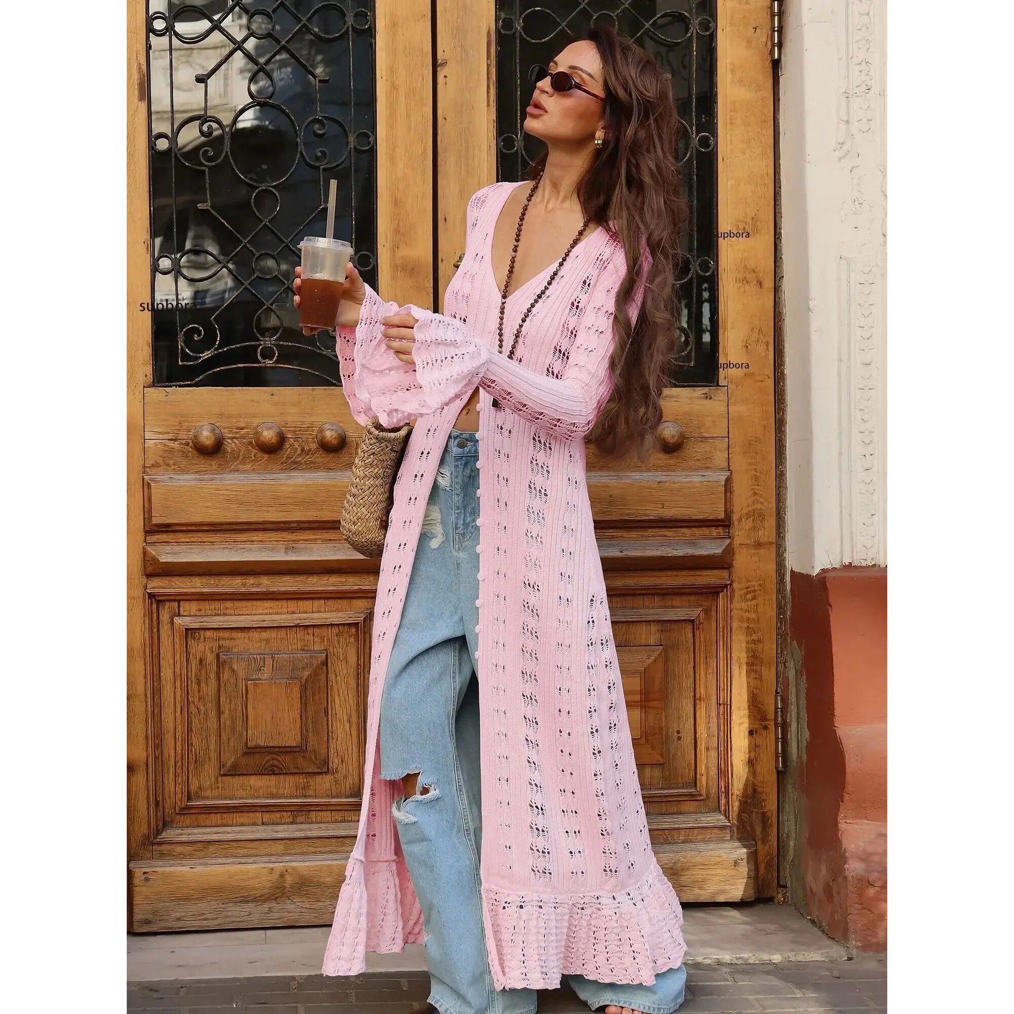neck openwork flared 镂空喇叭袖 loose 女V sleeve cardigan 开衫