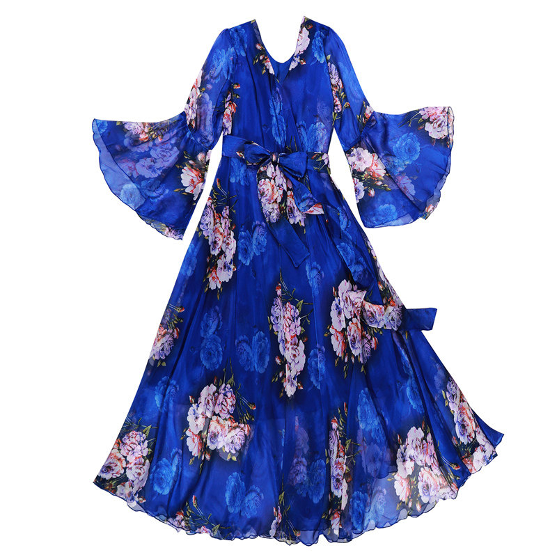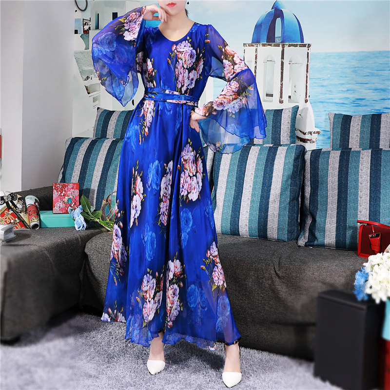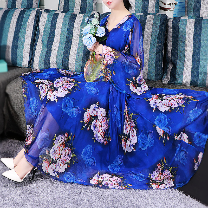 法式 显瘦碎花气质长袖 复古长裙 春夏雪纺油画连衣裙女大码 2021新款
