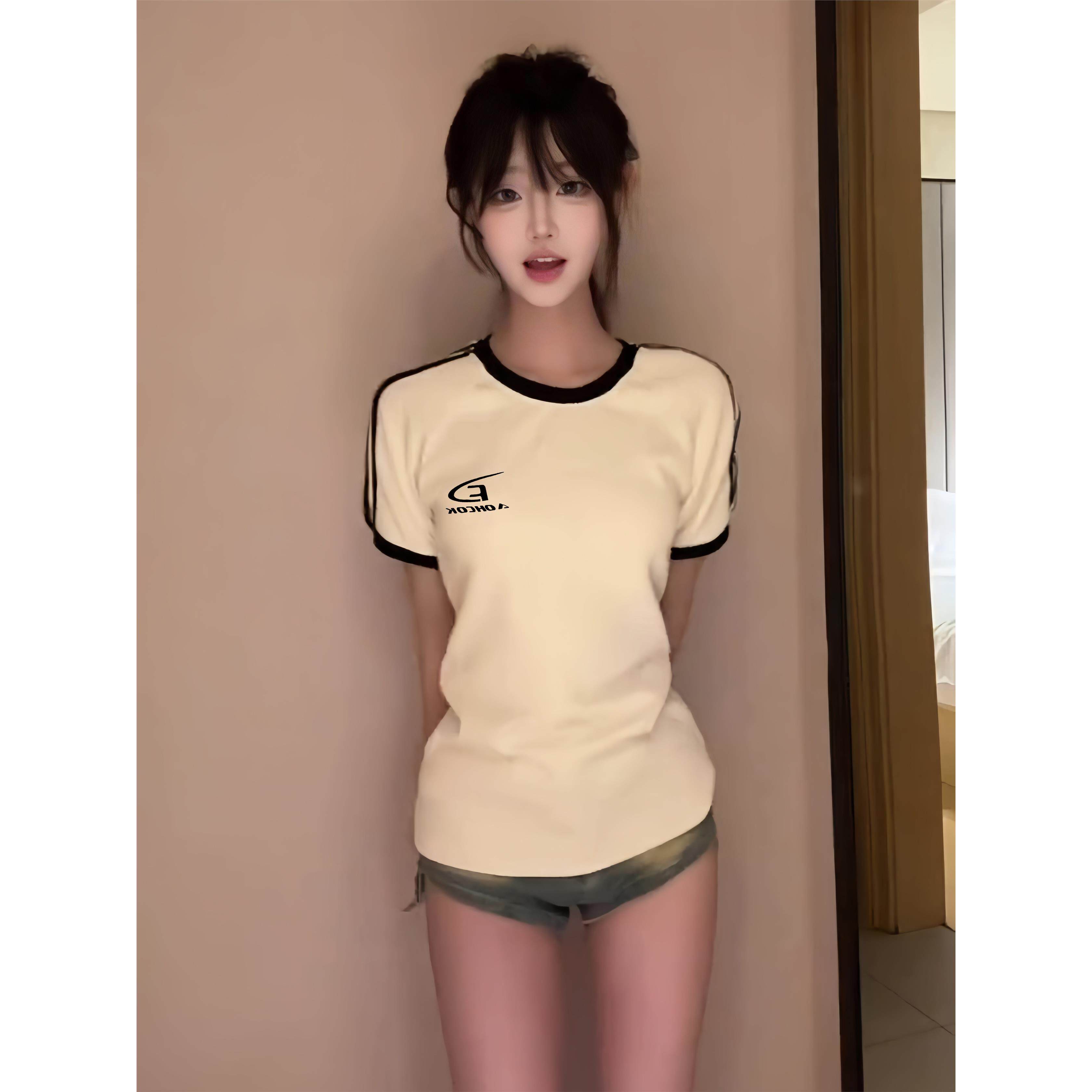 上衣 t恤女夏设计感小众辣妹别致运动短款 美式 覆古三条杠正肩短袖