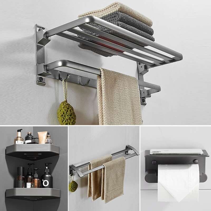 ecoco枪灰毛巾架免打孔卫生间浴室置物架厕所浴巾架一体太空铝架