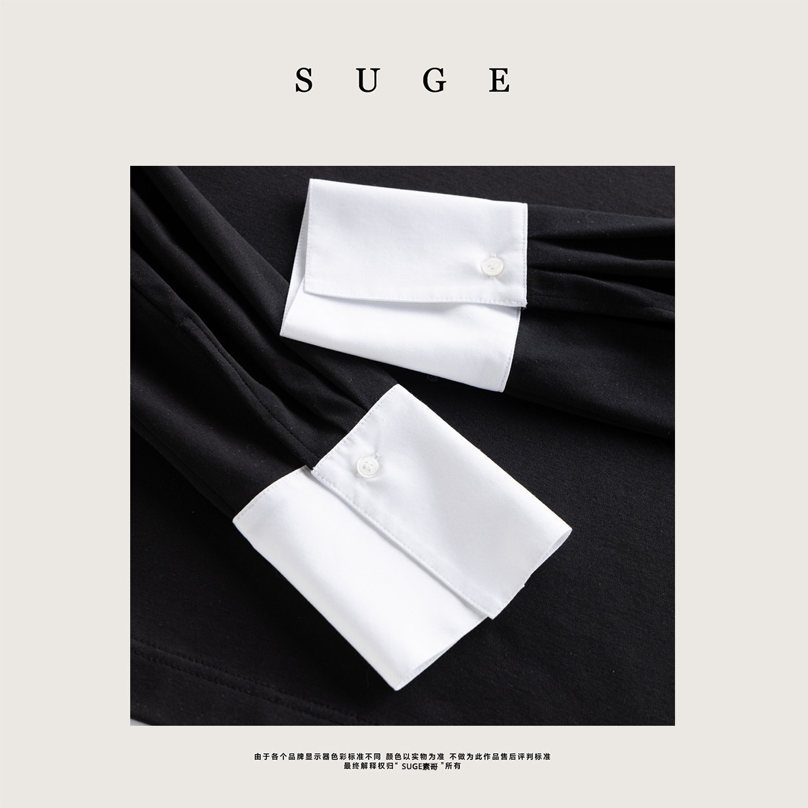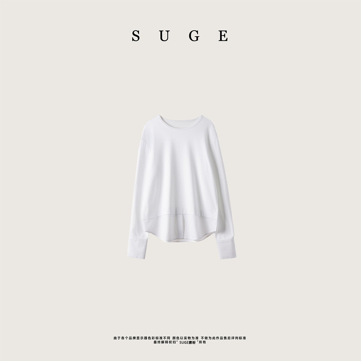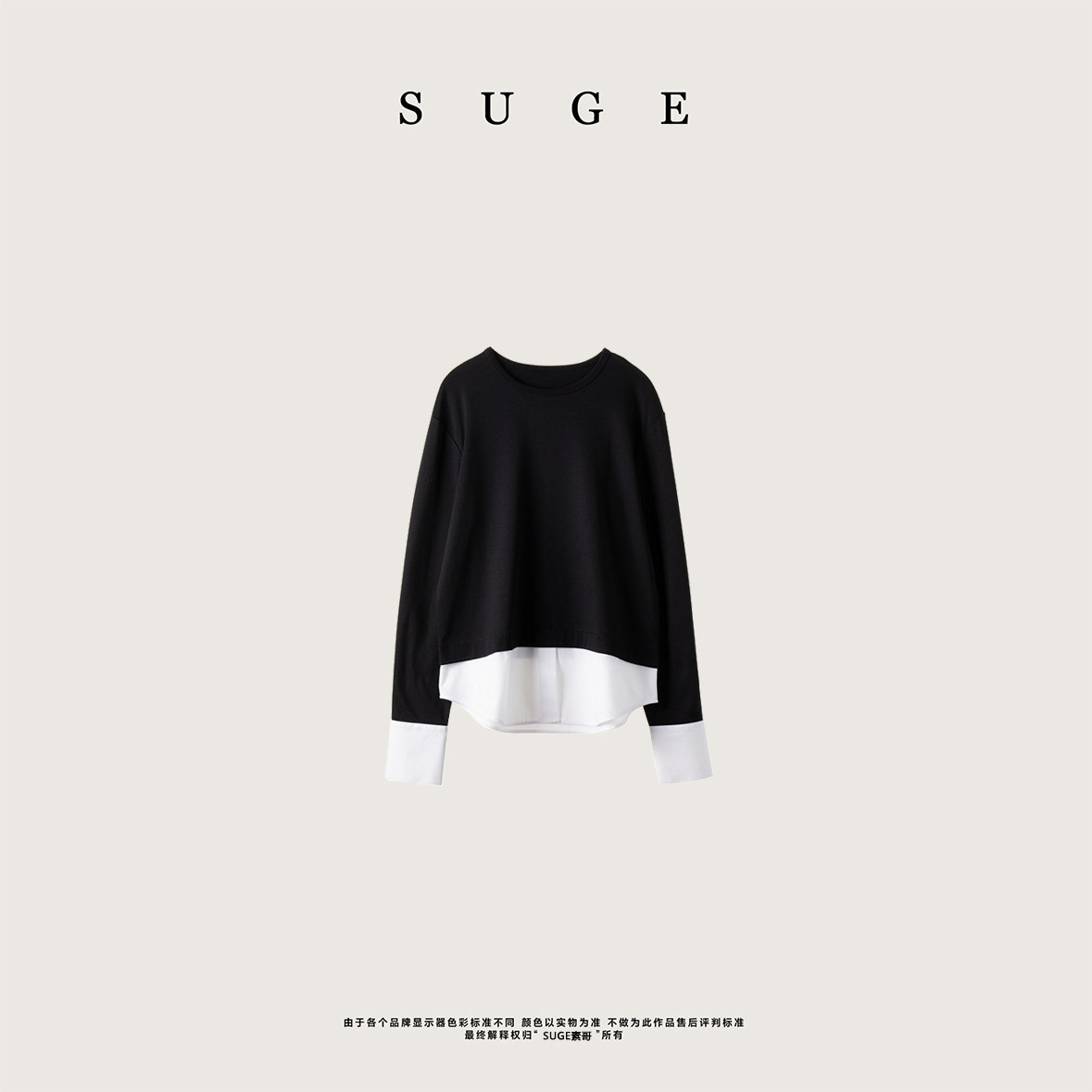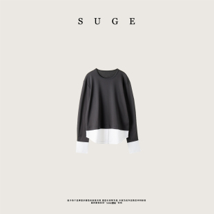 T恤假两件长袖 黑白拼接罗马布衬衫 撞色圆领宽松上衣 经典 SUGE素哥