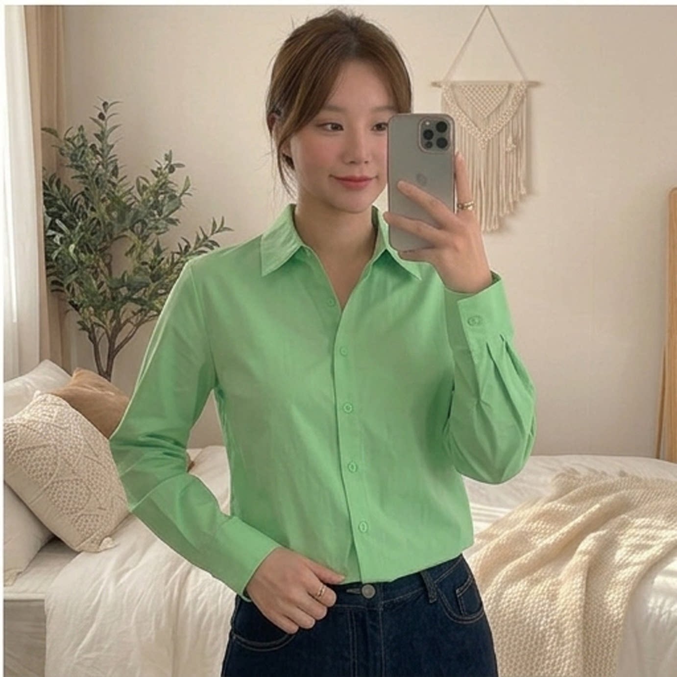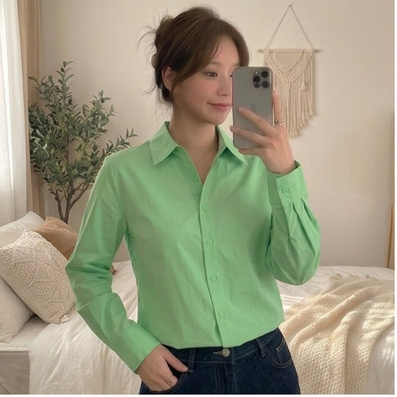 翻领高级感显瘦上衣 女长袖 法式 温柔风绿色真丝衬衫