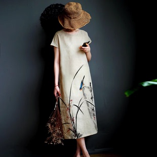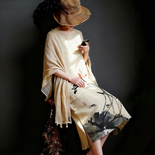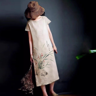 连衣裙茶艺国潮长裙国风旗袍 100%亚麻人工手绘新中式 水墨沐暖