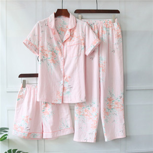 纯棉纱布春秋全棉家居服套装 棉纱睡衣三件套女夏季 短裤 长裤 薄 短袖