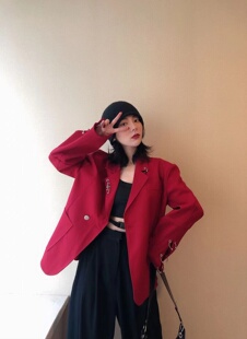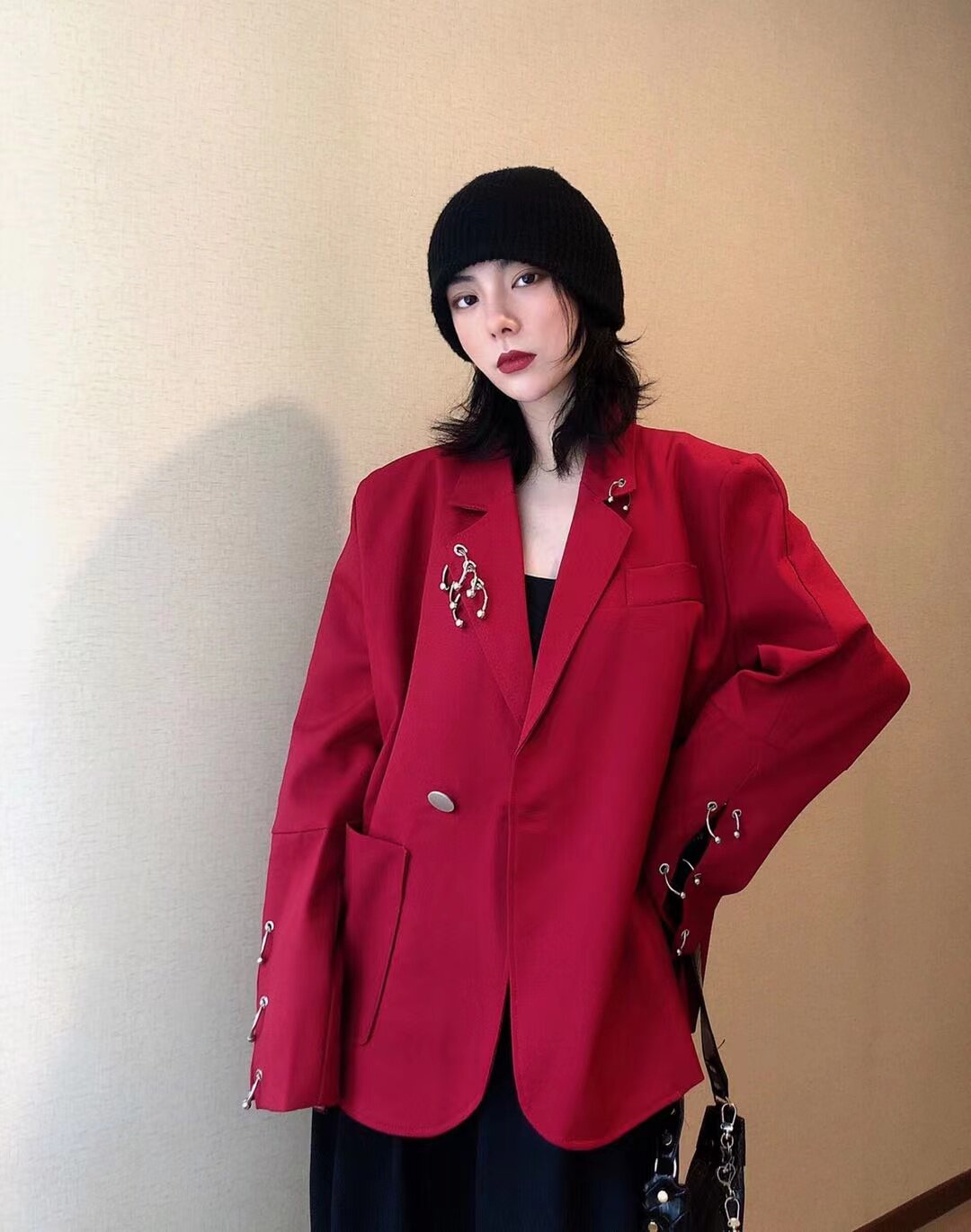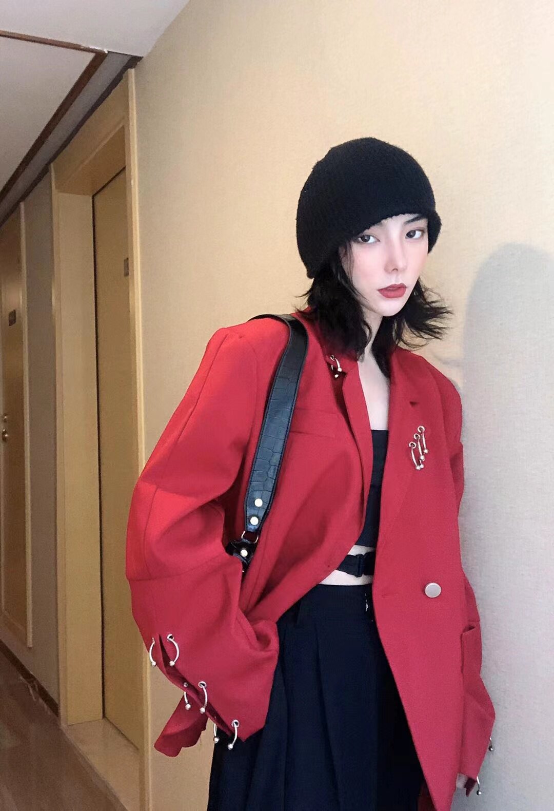 发电站 酒红色西装 2019春季 金属圆环宽松中性款 外套男女 新款