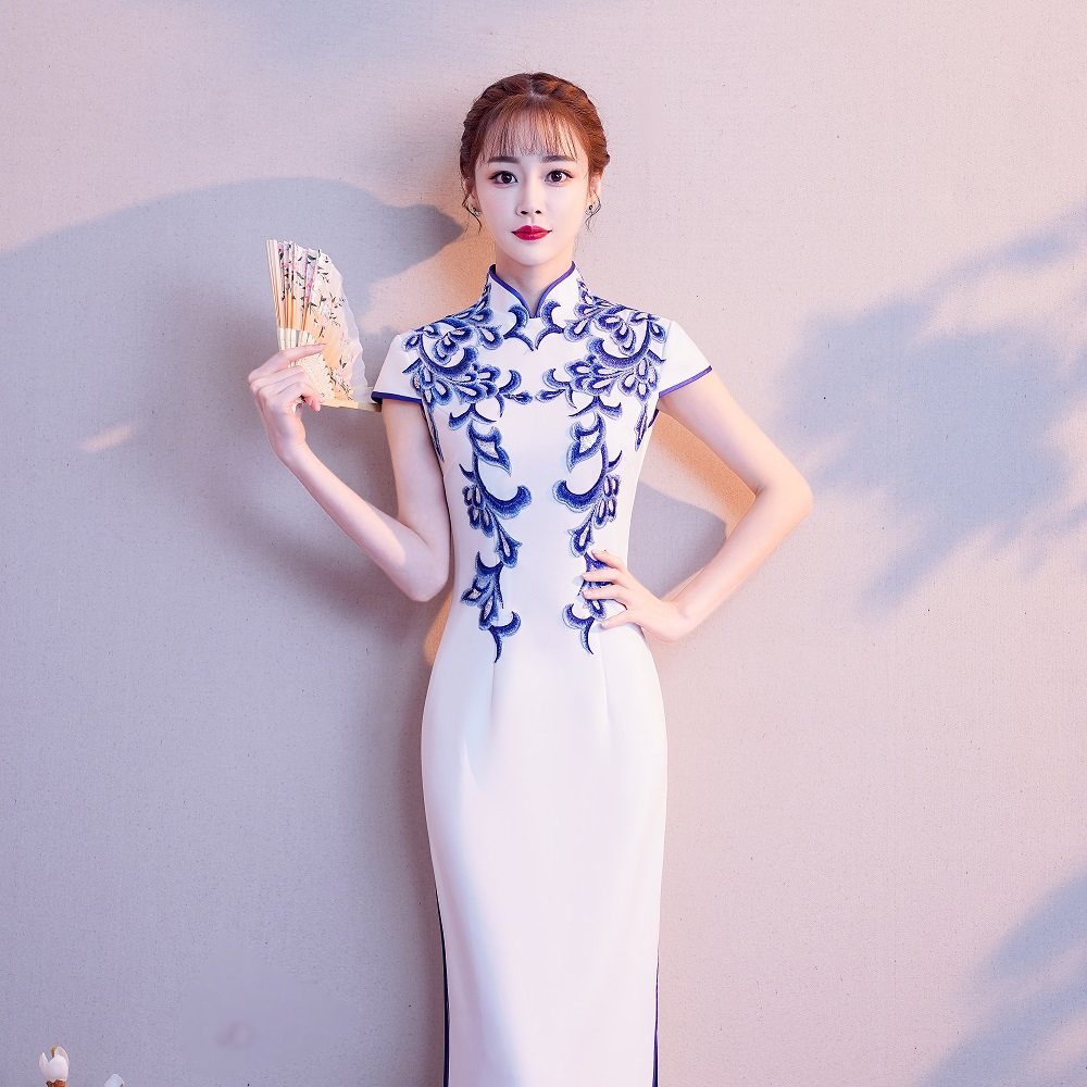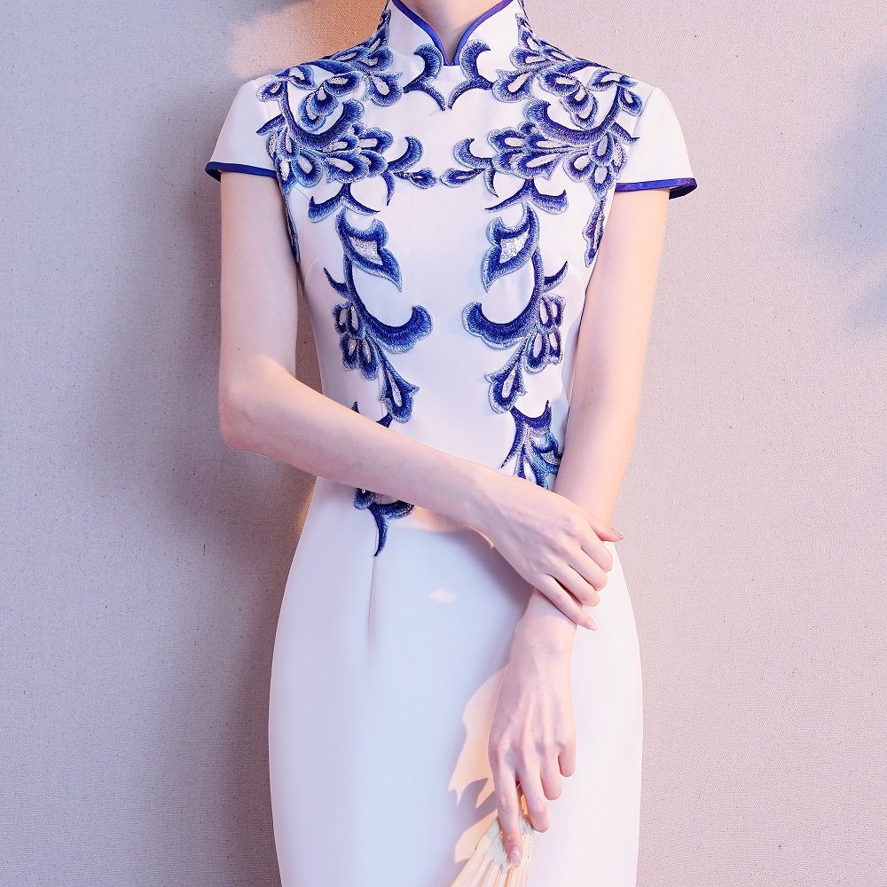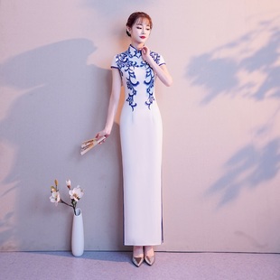 织锦缎礼仪长旗袍剪彩走秀短袖 旗袍裙 旗袍连衣裙演出拍照活动女装