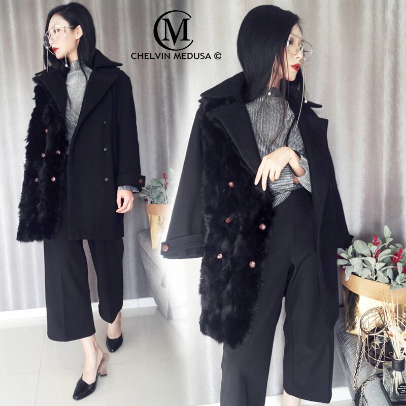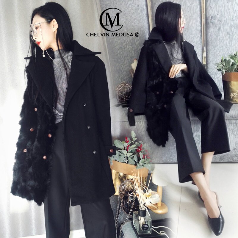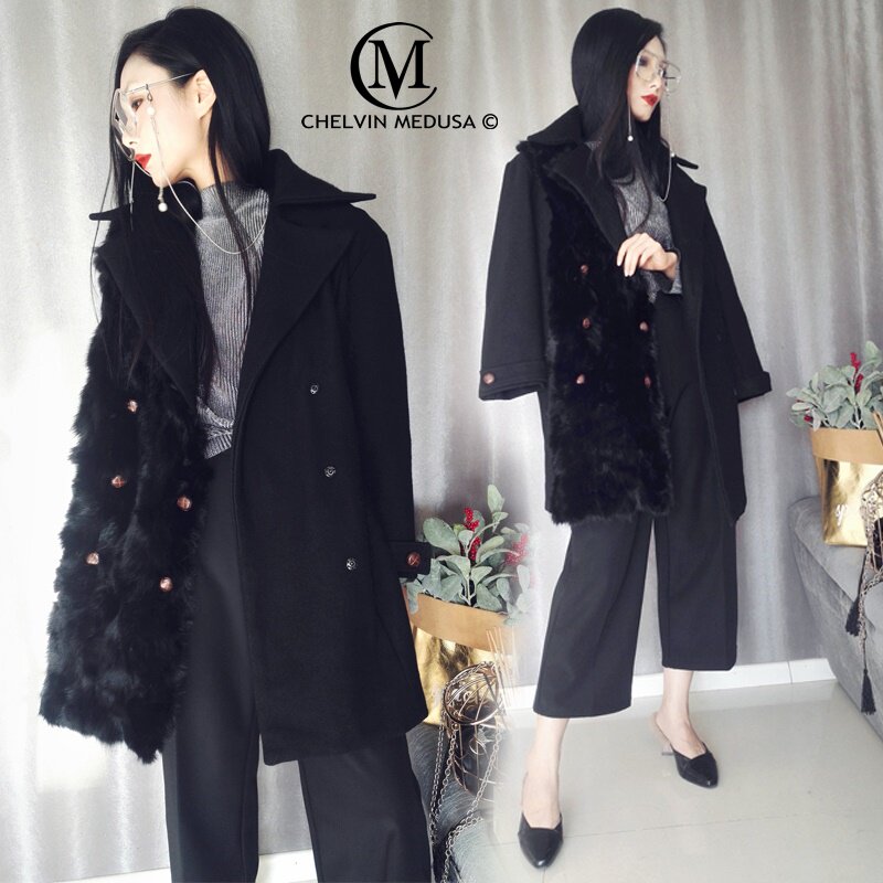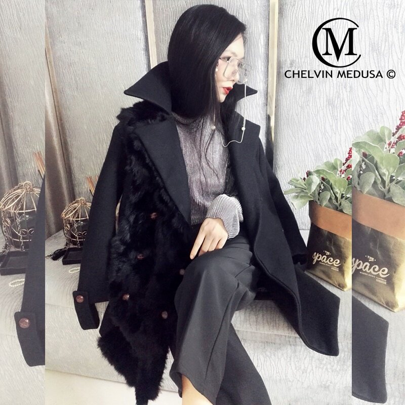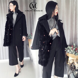 欧洲站黑真皮兔毛毛皮毛一体外套女派克服中长款 大衣皮草2021新款