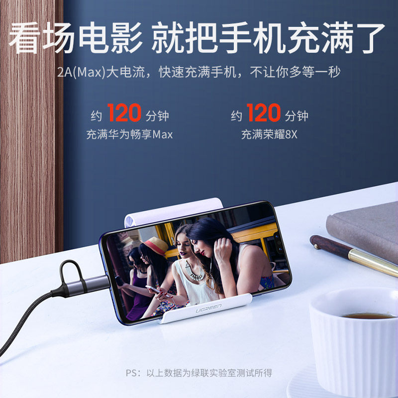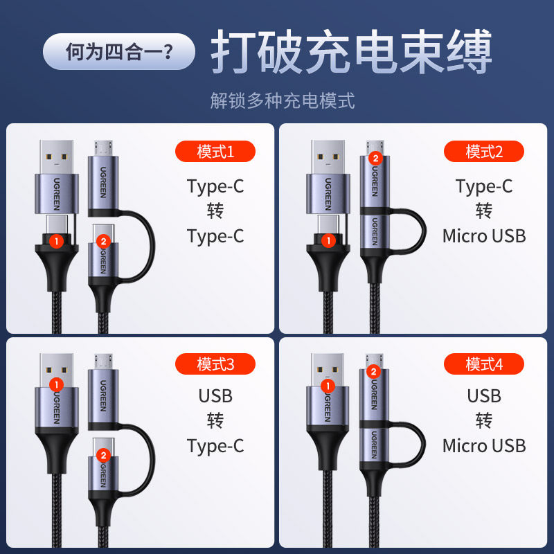 绿联二合一数据线PD 60W快充线usb转typec安卓充电器线micro多头适用苹果ipadair5华为小米macbook笔记本手机